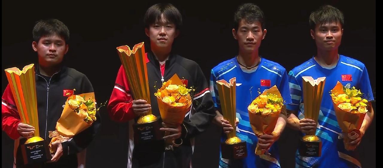 王楚钦三冠王。 王楚钦获得男单冠军, 男双冠军,混双冠军。 王楚钦对自己说, 你是最棒的。 这次的中国大满贯比赛, 身兼三项,一日多赛, 也是让王楚钦很疲惫的了。 正如王楚钦所说, 是使命让他坚持。 正是有了这份担当, 让王楚钦走的更远, 这场比赛, 王楚钦没有给勒布伦机会, 以快节奏,快衔接, 来压制勒布伦, 直落四局,拿下比赛。