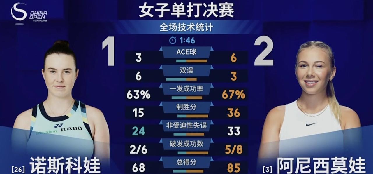 阿尼西莫娃“送蛋”诺斯科娃职业生涯首夺中网女单冠军! 阿尼西莫娃在半决赛仅丢三局便横扫卫冕冠军高芙晋级决赛!此役的对手是半决赛挽救三个赛点战胜“大富”佩古拉的诺斯科娃!双方此前交手2次各胜1场! 首盘比赛职业生涯首进WTA1000级别赛事决赛的诺斯科娃在场上十分紧张,阿尼西莫娃抓住机会连赢六局“送蛋”获胜;第二盘比赛诺斯科娃迅速调整状态,两次成功破发后以6:2扳回一盘;决胜盘阿尼西莫娃抓住对手体能下降的机会在2:2后连赢四局职业生涯首夺中网冠军!诺斯科娃虽然决赛失利,但通过打进中网决赛收获的650个积分,世界排名上升至第17位创职业生涯新高!