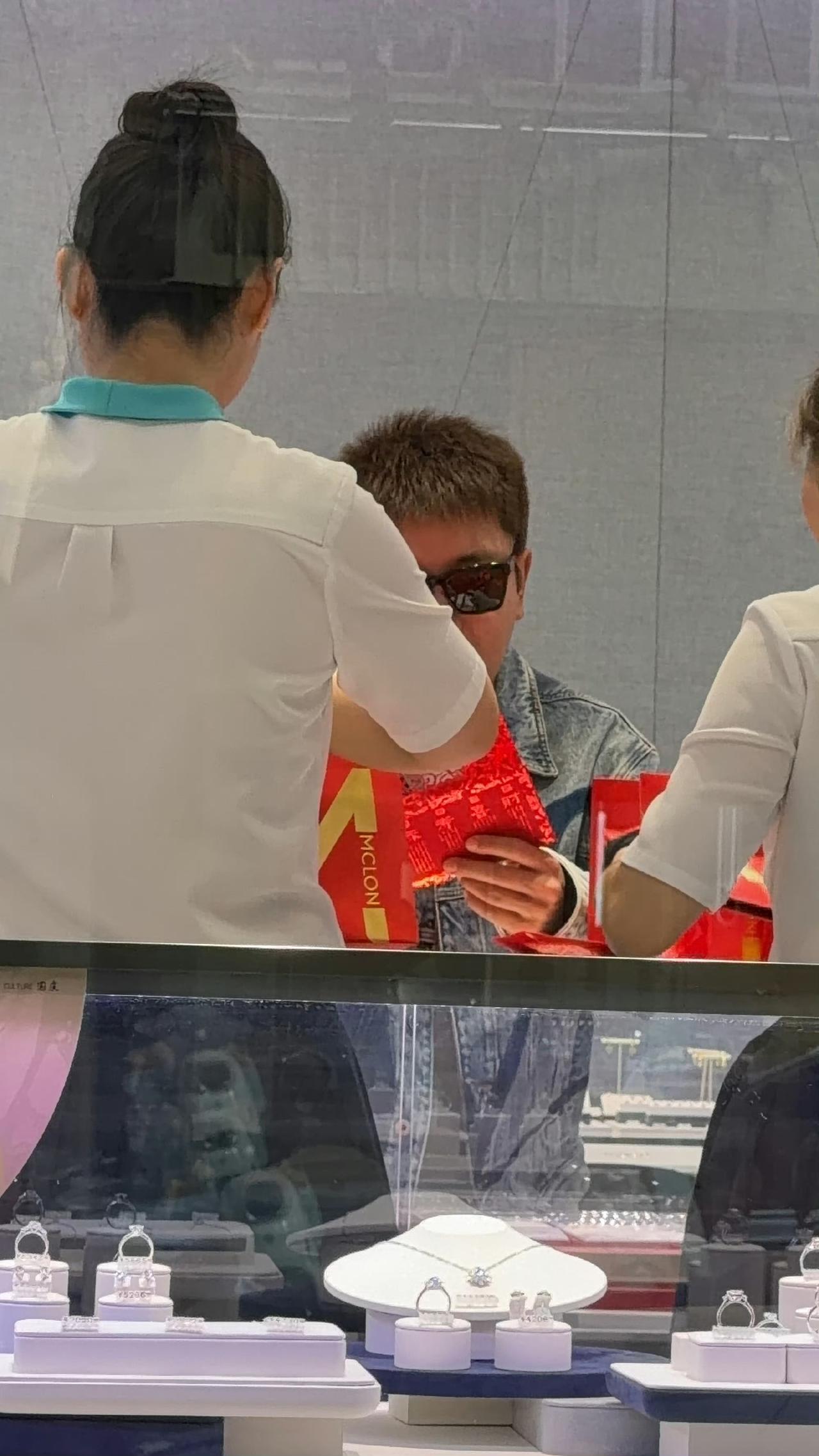 今天中秋节网友偶遇贾乃亮在金店买金钞,贾乃亮当时穿着蓝色牛仔外套,带了一副墨镜,