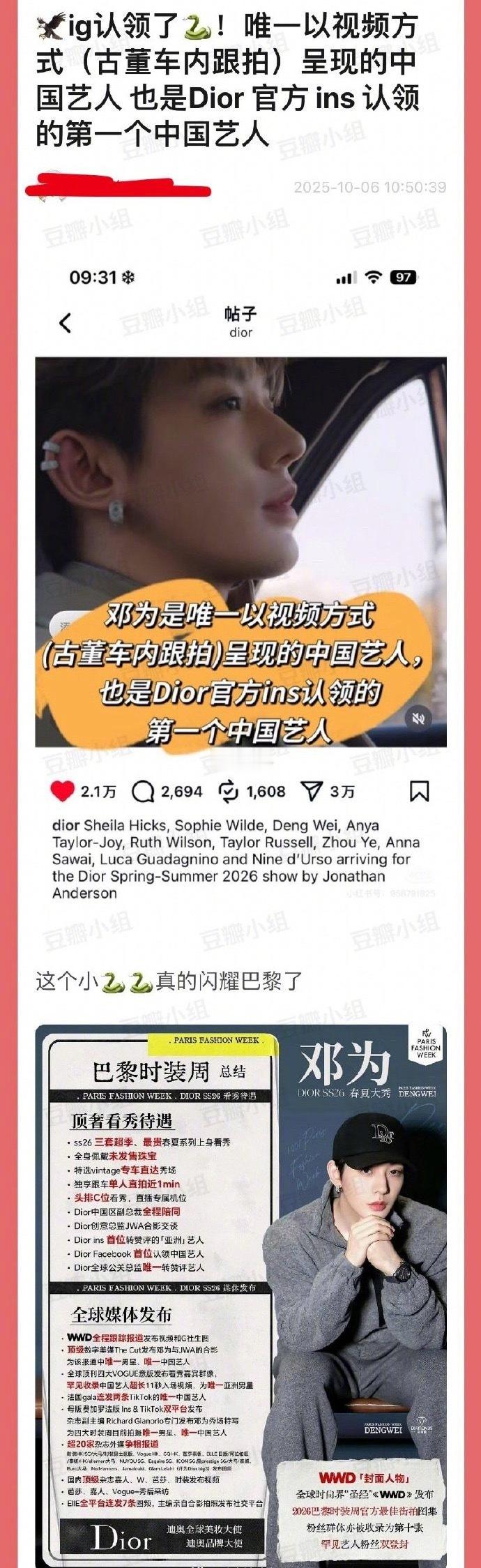 邓为是迪奥现任全球公关总监上任后首位公开认领的中国区艺人+官方ig唯一视频的方式(古董车内跟拍)呈现的中国艺人+官方ins认领的第一个中国艺人,这待遇什么水平?