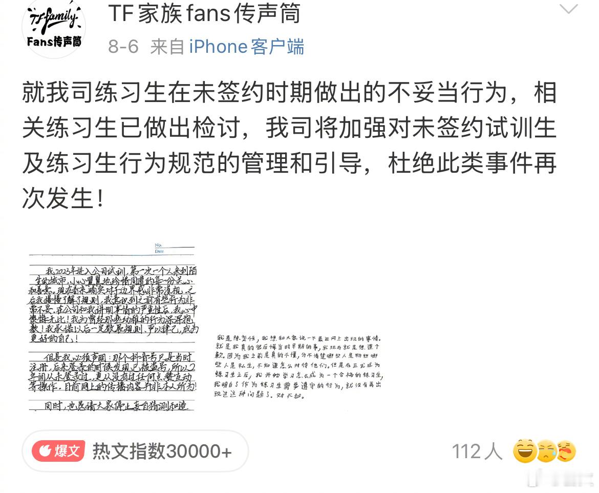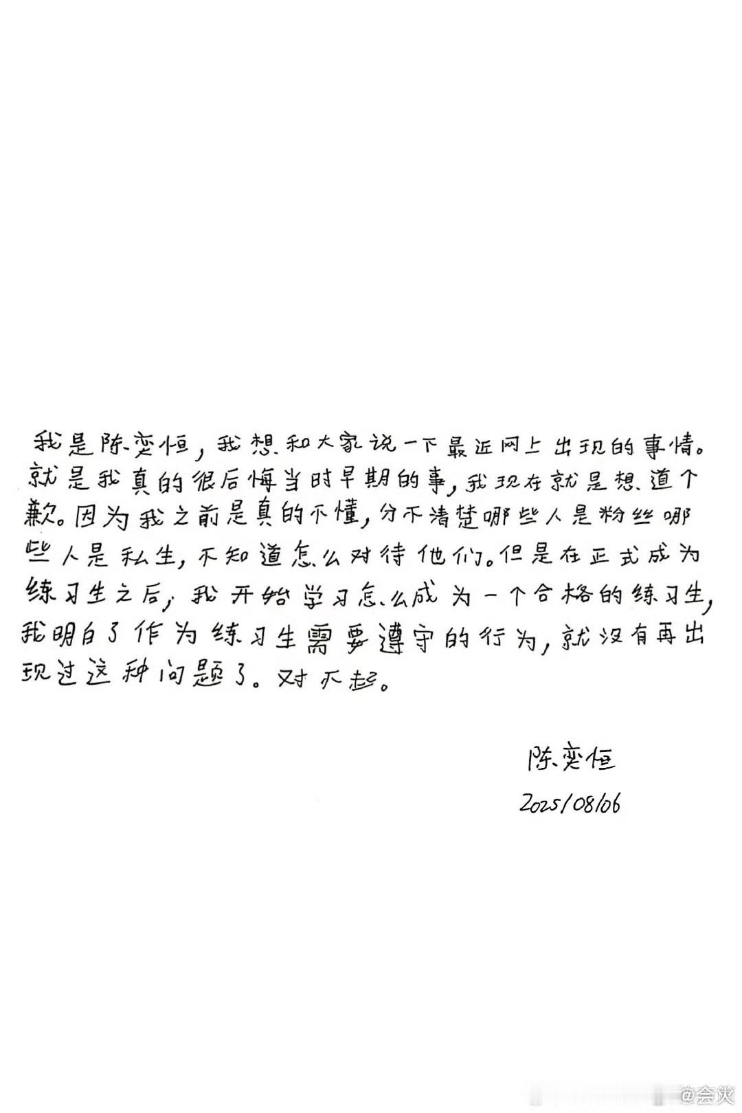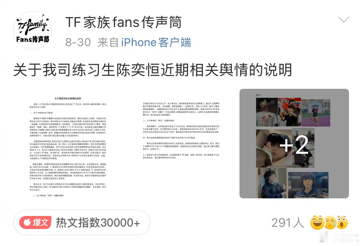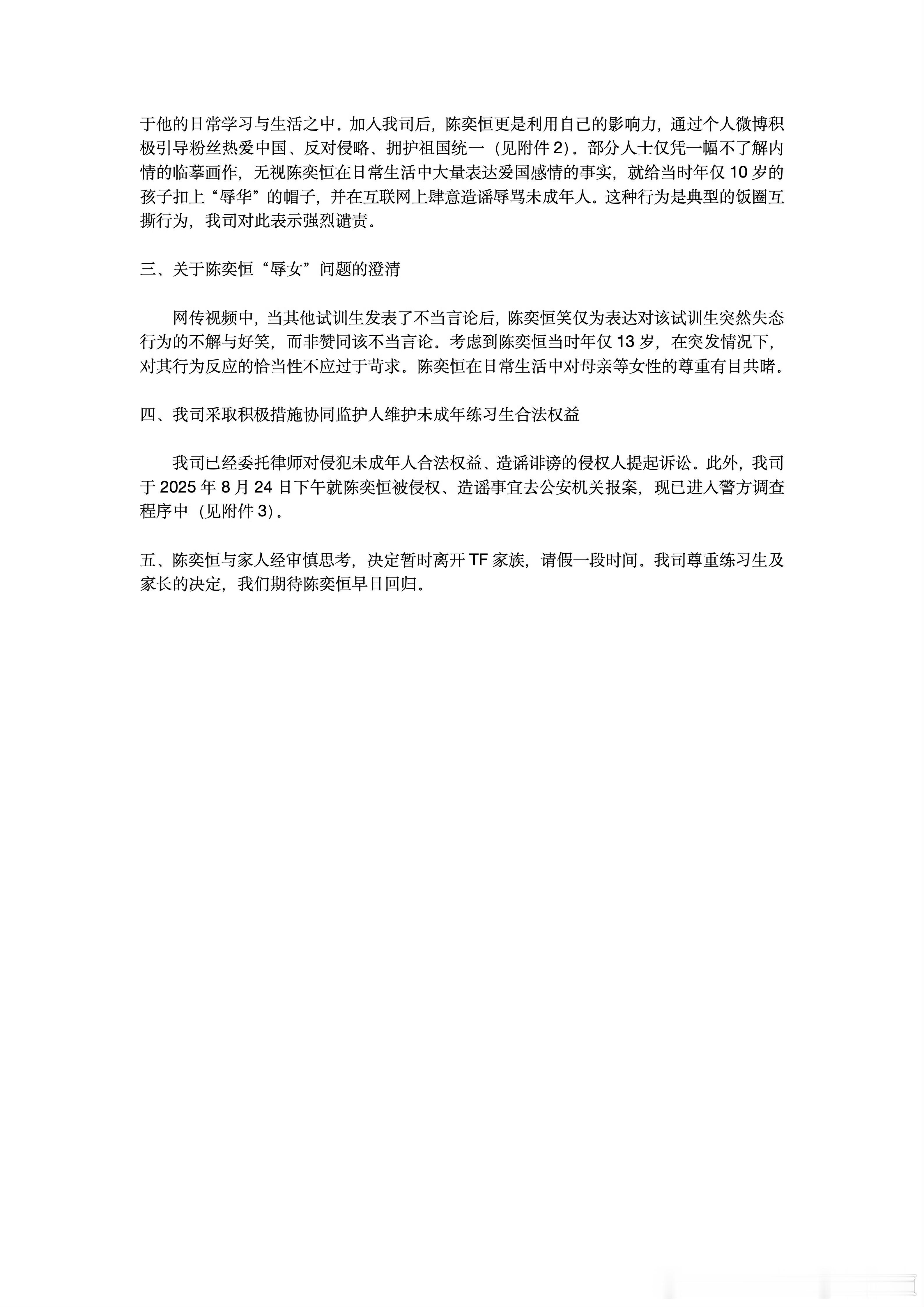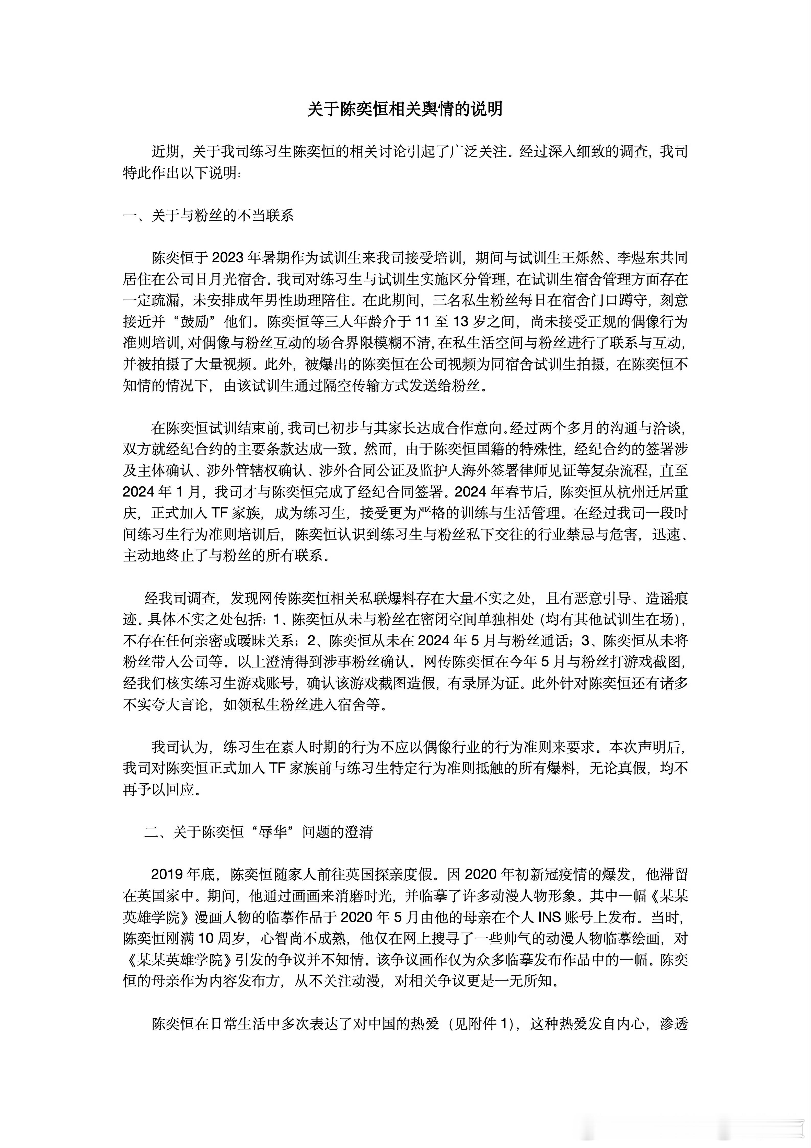 8月底,陈奕恒因作风舆情问题,决定暂时离开TF家族。