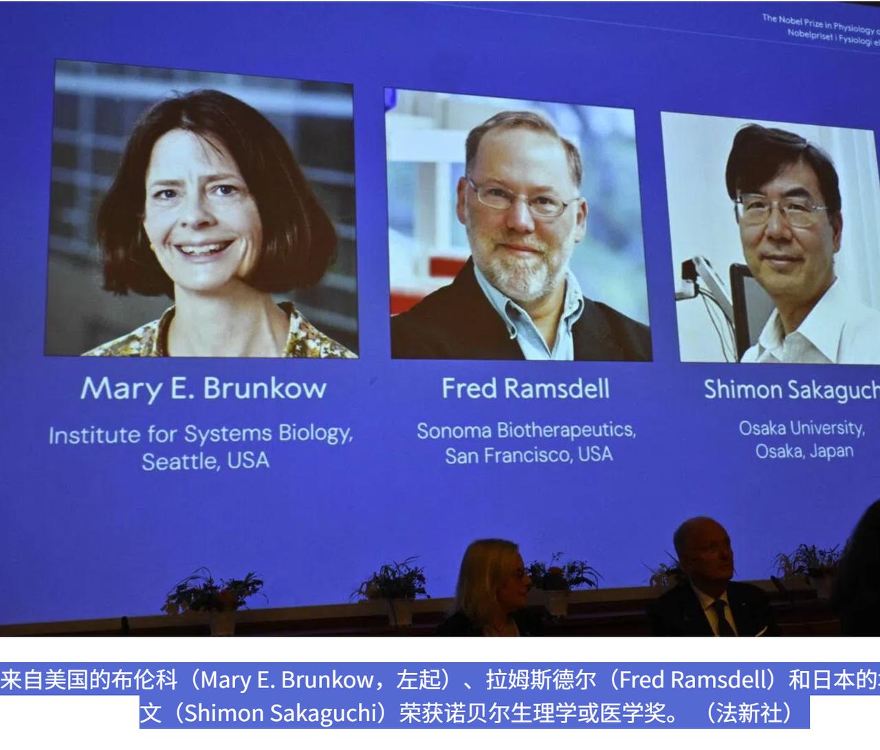 nuo贝尔是个奇男子 来自美国的布伦科(Mary E. Brunkow,左起)、拉姆斯德尔(Fred Ramsdell)和日本的坂口志文(Shimon Sakaguchi)荣获诺贝尔生理学或医学奖。 (法新社) 诺贝尔奖评审团宣布,美国科学家布伦科和拉姆斯德尔,以及日本科学家坂口志文荣获诺贝尔生理学或医学奖,以表彰他们在免疫系统调控机制方面的研究成果。 法新社报道,布伦科(Mary E. Brunkow)、拉姆斯德尔(Fred Ramsdell)和坂口志文(Shimon Sakaguchi)星期一(10月6日)共同获得这个殊荣。 评审团说,这三人“因在外周免疫耐受(peripheral immune tolerance)方面的发现”而获奖。