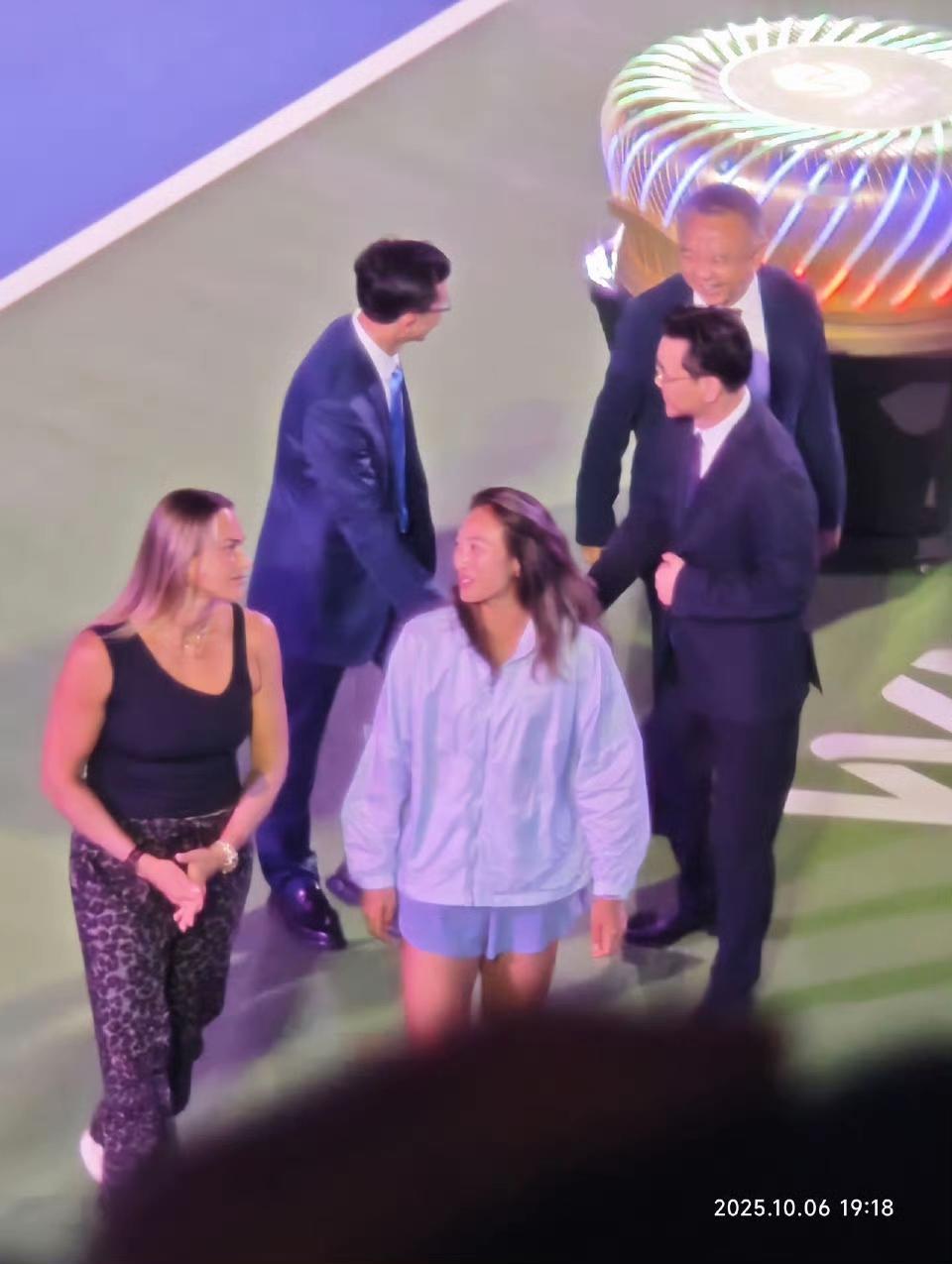 这次武网开幕式很隆重,邀请了很多高层,白主任也来了,昨晚他还在北京给亚军颁发奖牌,今天就跑去武汉。球员代表是萨巴伦卡和郑钦文。 退场时,虎妞跟小猫咪热聊,是不是在交流防热的感受。