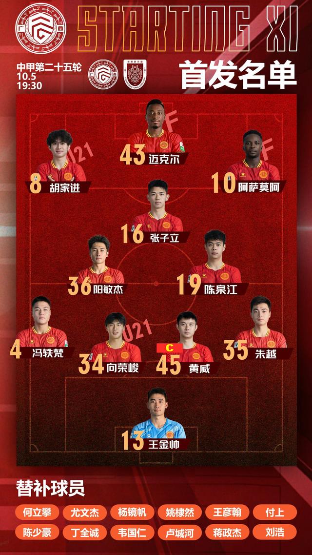 广西平果俱乐部发布的首发阵容海报,阿萨莫阿和黄威都在这场比赛首发出场。