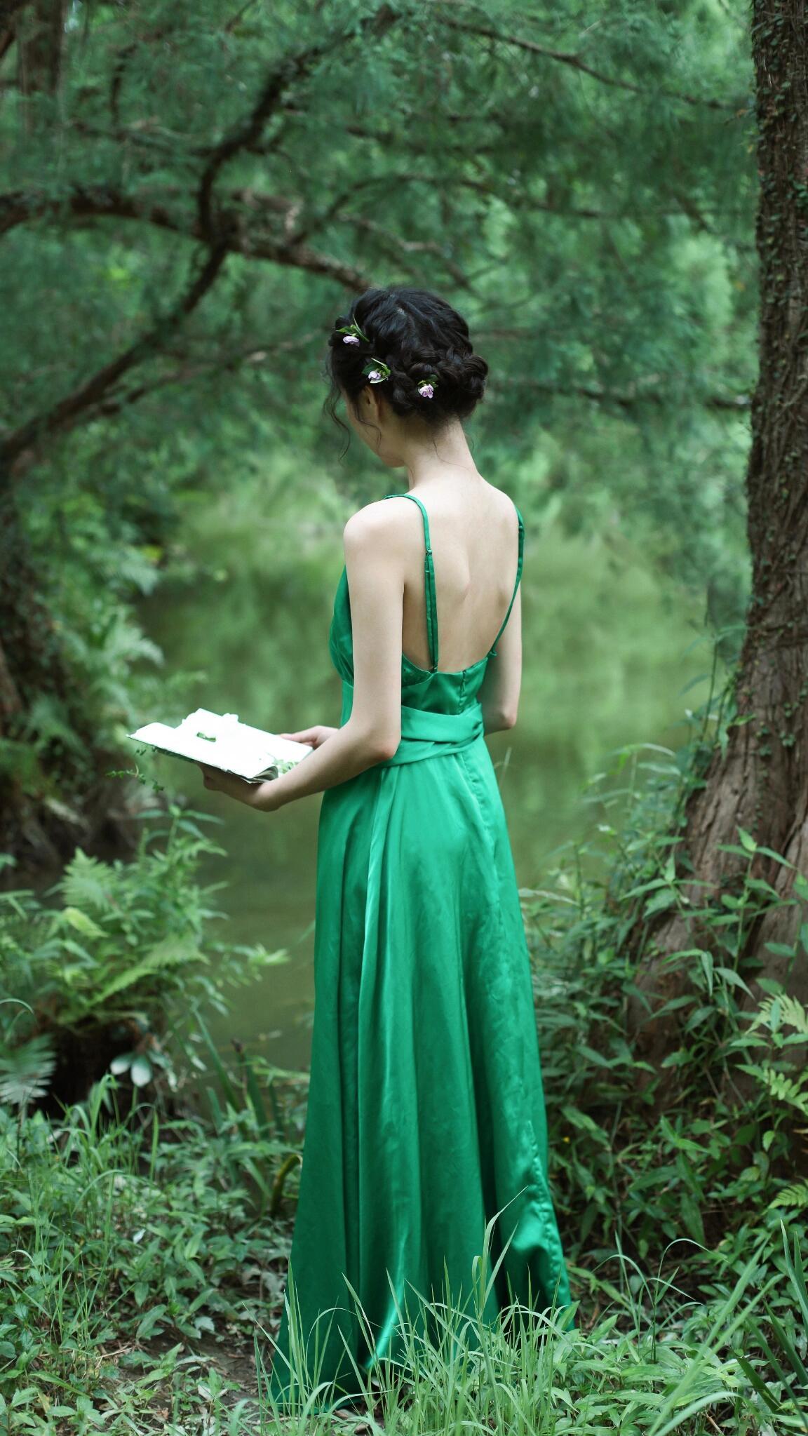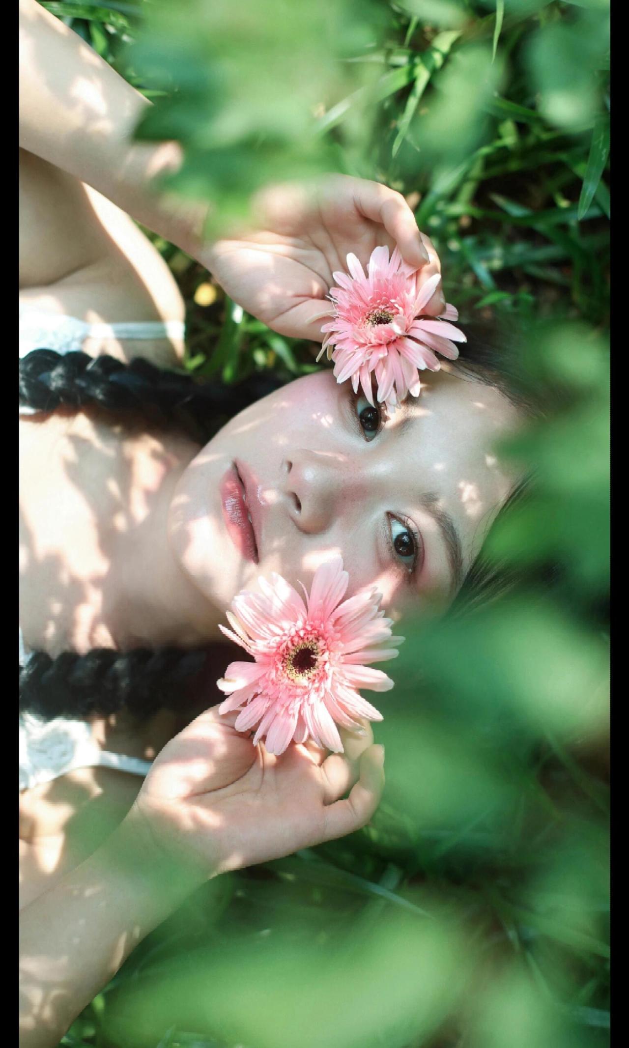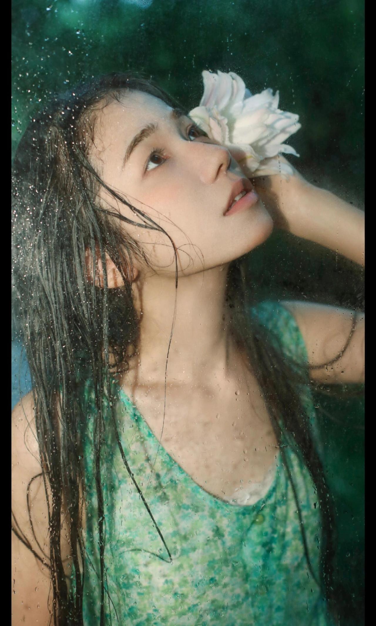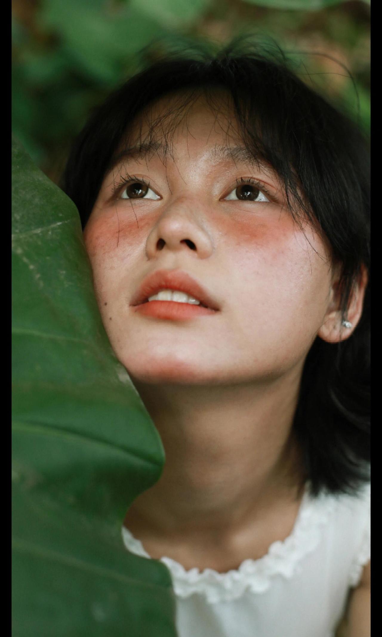 这张照片的魅力在于“以小见大”的情绪捕捉。画面中,大片的绿叶占据视觉左侧,形成强烈的框架感,将观者的目光自然引向模特的神态。模特的眼神是灵魂所在,那向上的凝视充满了天真的好奇与对自然的向往,仿佛在叶隙间窥见了只属于她的梦境。 妆容设计极具风格,面颊的红调不是传统的柔美腮红,更像是被森林气息晕染的自然气色,搭配清透的底妆,将“原生感”与“艺术感”融合得恰到好处。耳畔的小巧耳饰则是点睛之笔,在森系的质朴中加入一丝精致,让画面层次更丰富。光影上,柔和的散射光弱化了明暗对比,却强化了肌肤的细腻与叶片的肌理,整体氛围静谧又充满叙事感,仿佛在邀请观者猜测:她在叶后看见了什么?是一只昆虫的爬行,还是一缕光的舞蹈?这种留白式的表达,正是其动人之处。