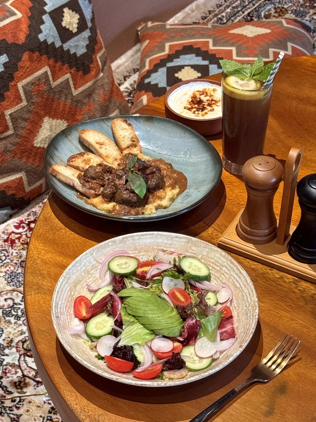 比土耳其本土还要正宗的的土耳其甜品🍮私心舍不得它太火… 自带花园庭院,席地而坐的地毯包间好有异域风情~真的很宝藏!叫:八哥! 特蕾斯蛋糕+米布丁+特浓红茶☕️好chill的土耳其下午茶!还有土耳其烤串、夏巴塔面包、玛格丽特分量也很扎实!!来义乌值得一试!