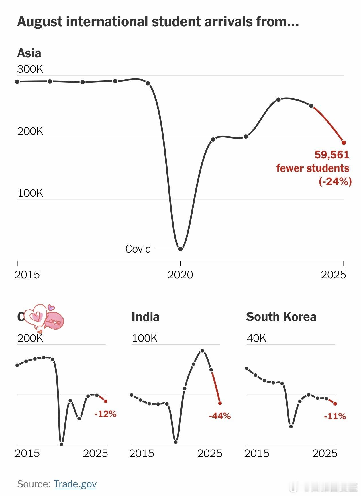 今年八月入境的亚洲学生,少六万人,其中印度降幅最大,其次是韩国等