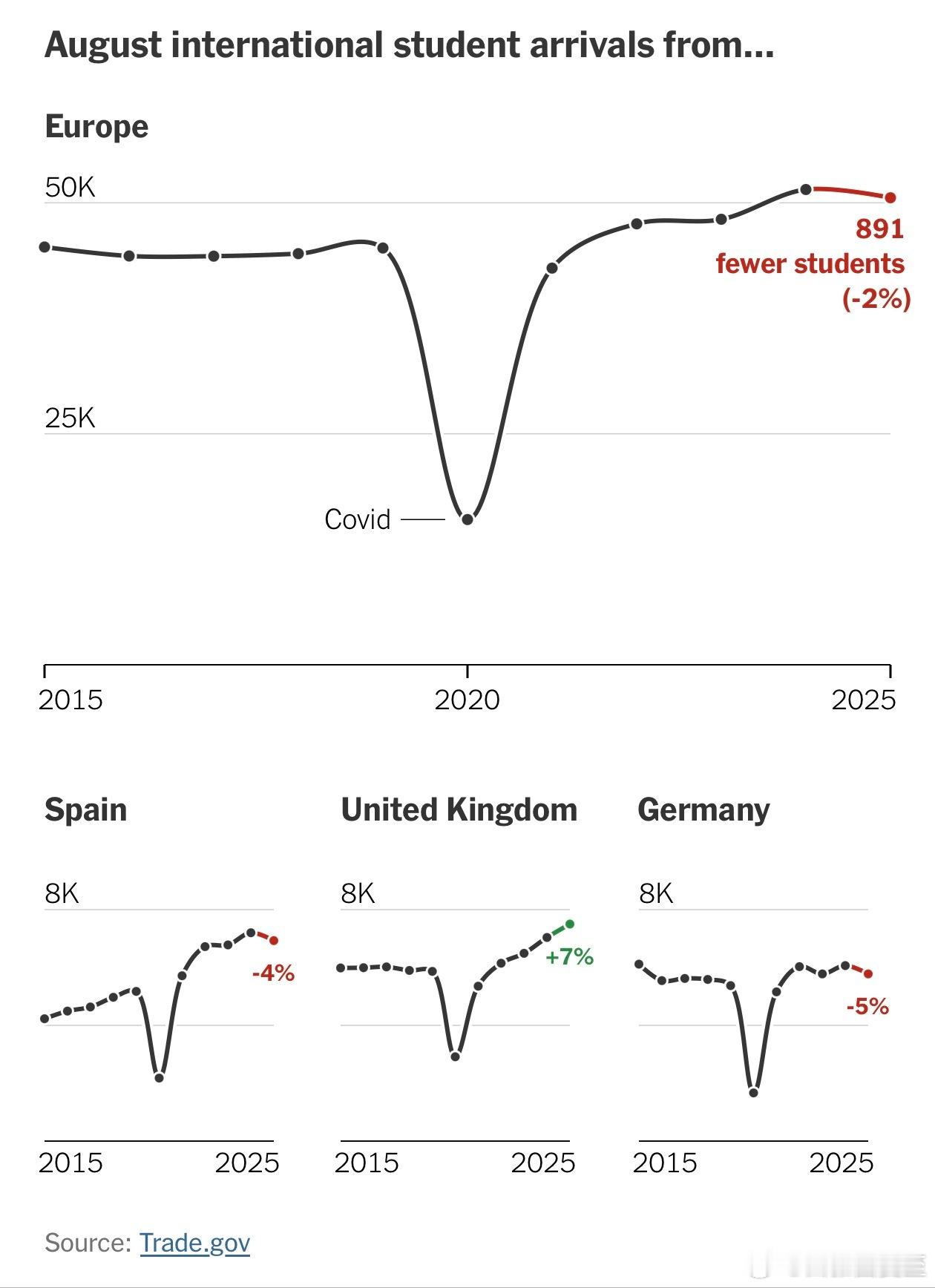 来自欧洲的留学生变化不大,共减少九百人,来自英国的,甚至增加了7%