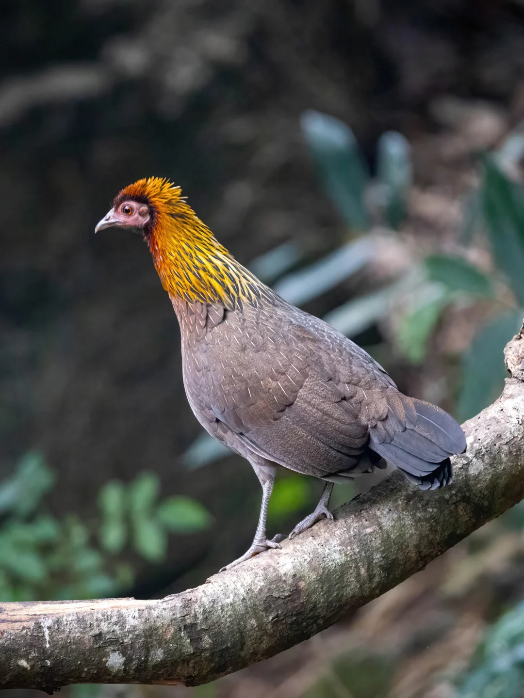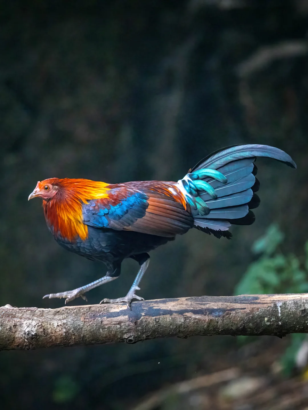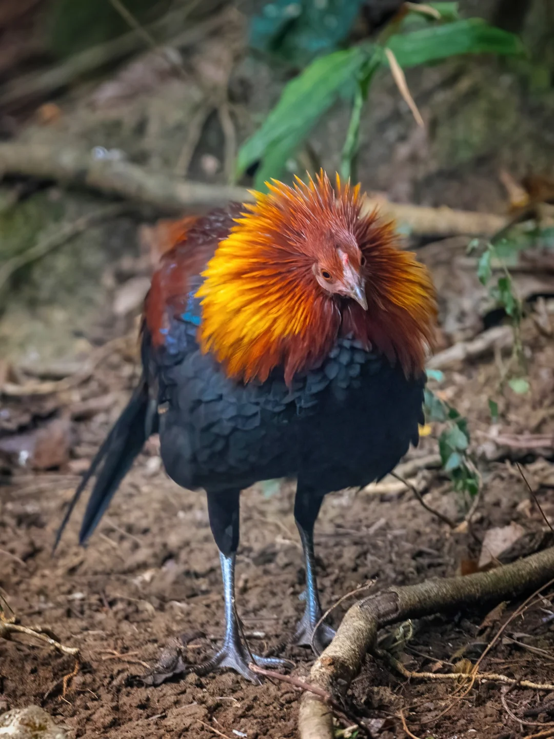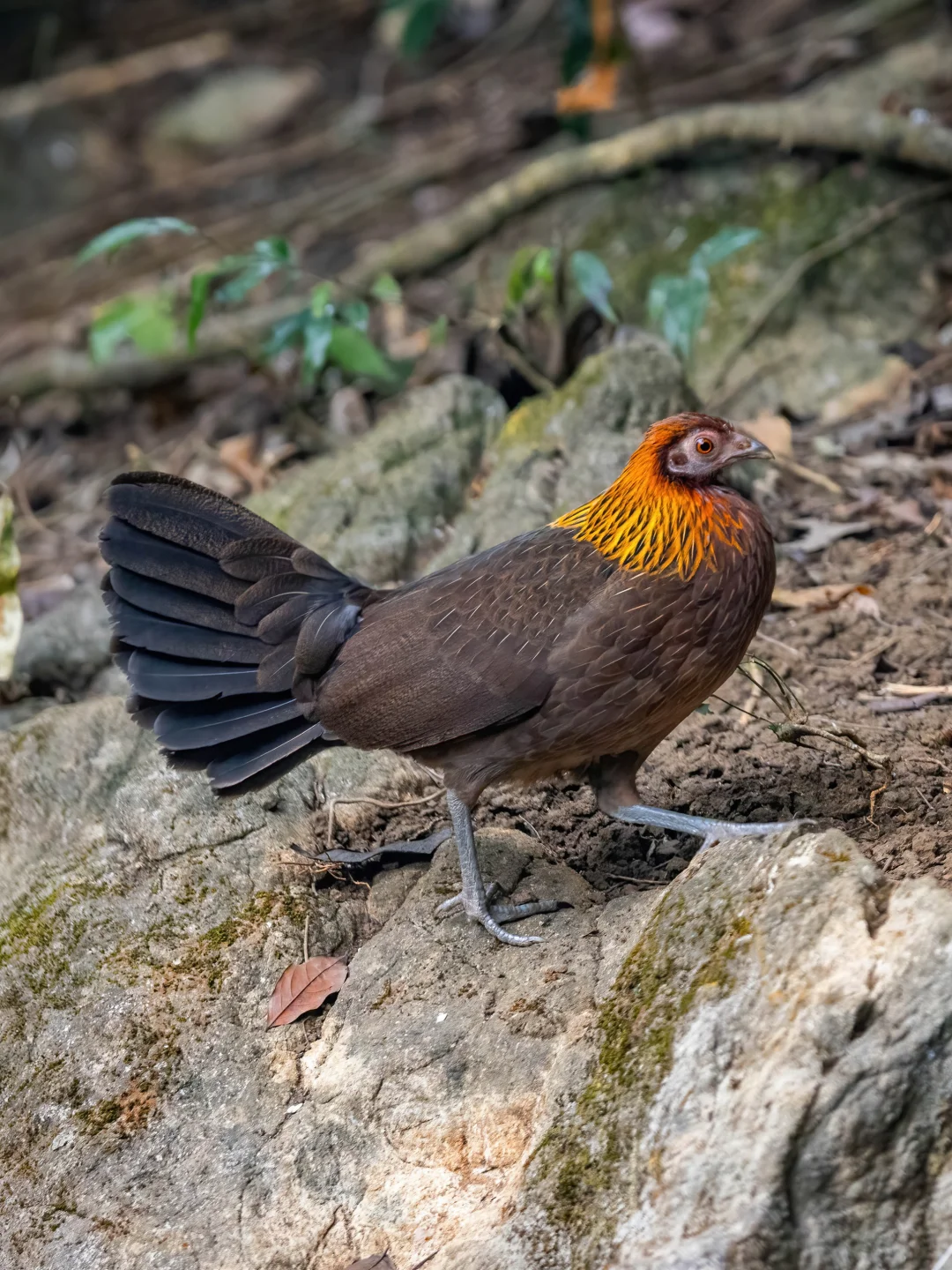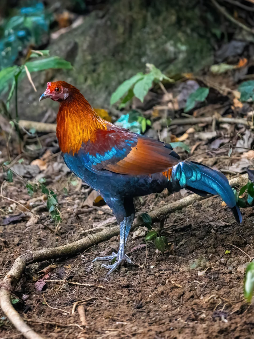偶然一看这不就和家鸡长得差不多吗,但是作为家鸡的野生祖先,颜值是家鸡的鲜艳升级版。红原鸡拥有橙色、棕色、红色、金色、灰色、白色、橄榄色、金属绿色的羽毛组合。不过这次在广西看到的两只雄鸡鸡冠都不明显。雌鸡(p7-10)的羽毛较暗淡,不过颈部的金色羽毛也很漂亮。