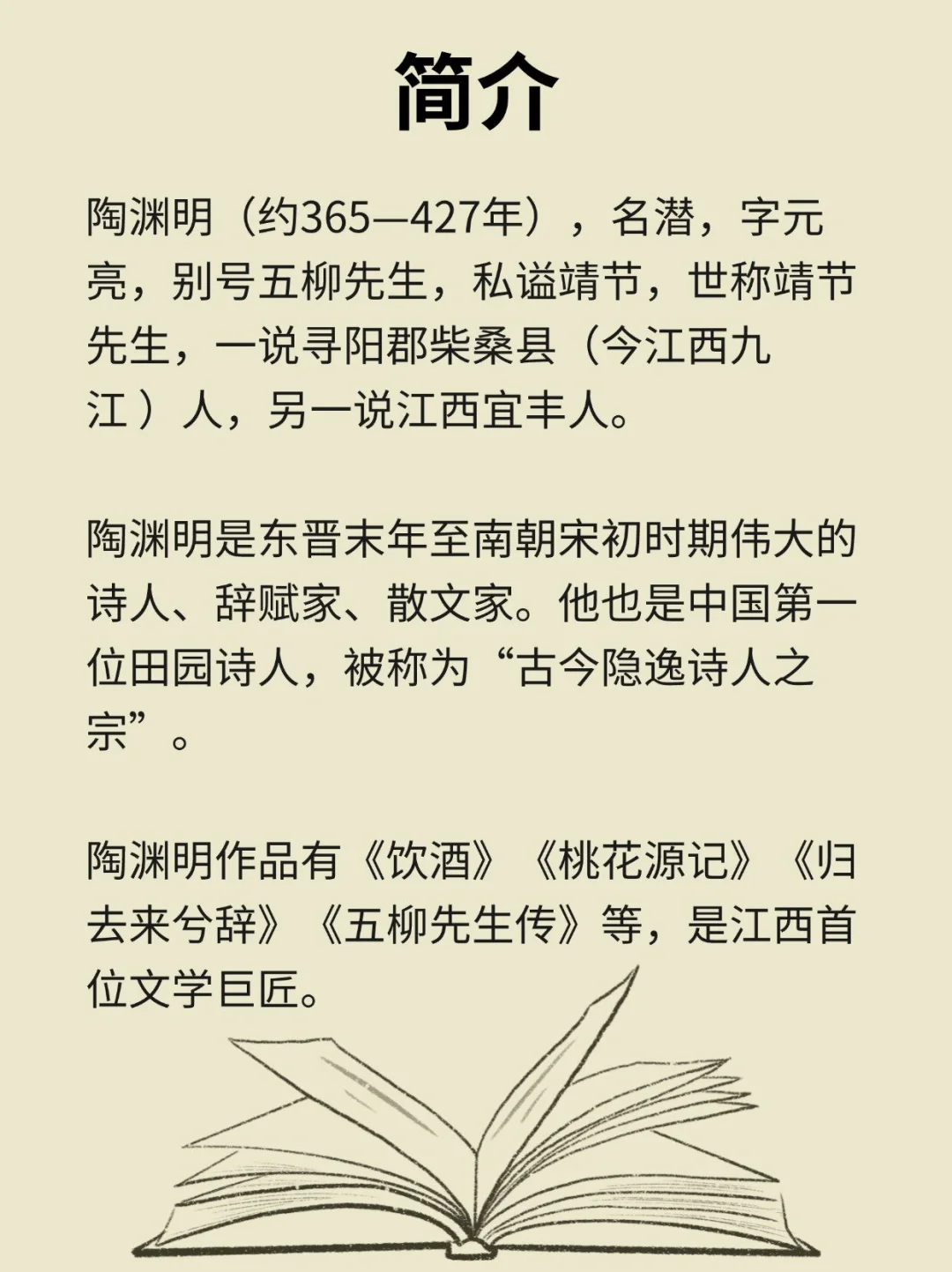 💫陶渊明是东晋末至南朝宋初期伟大的诗人、辞赋家、散文家。他是中国第一位田园诗人,被称为“古今隐逸诗人之宗”