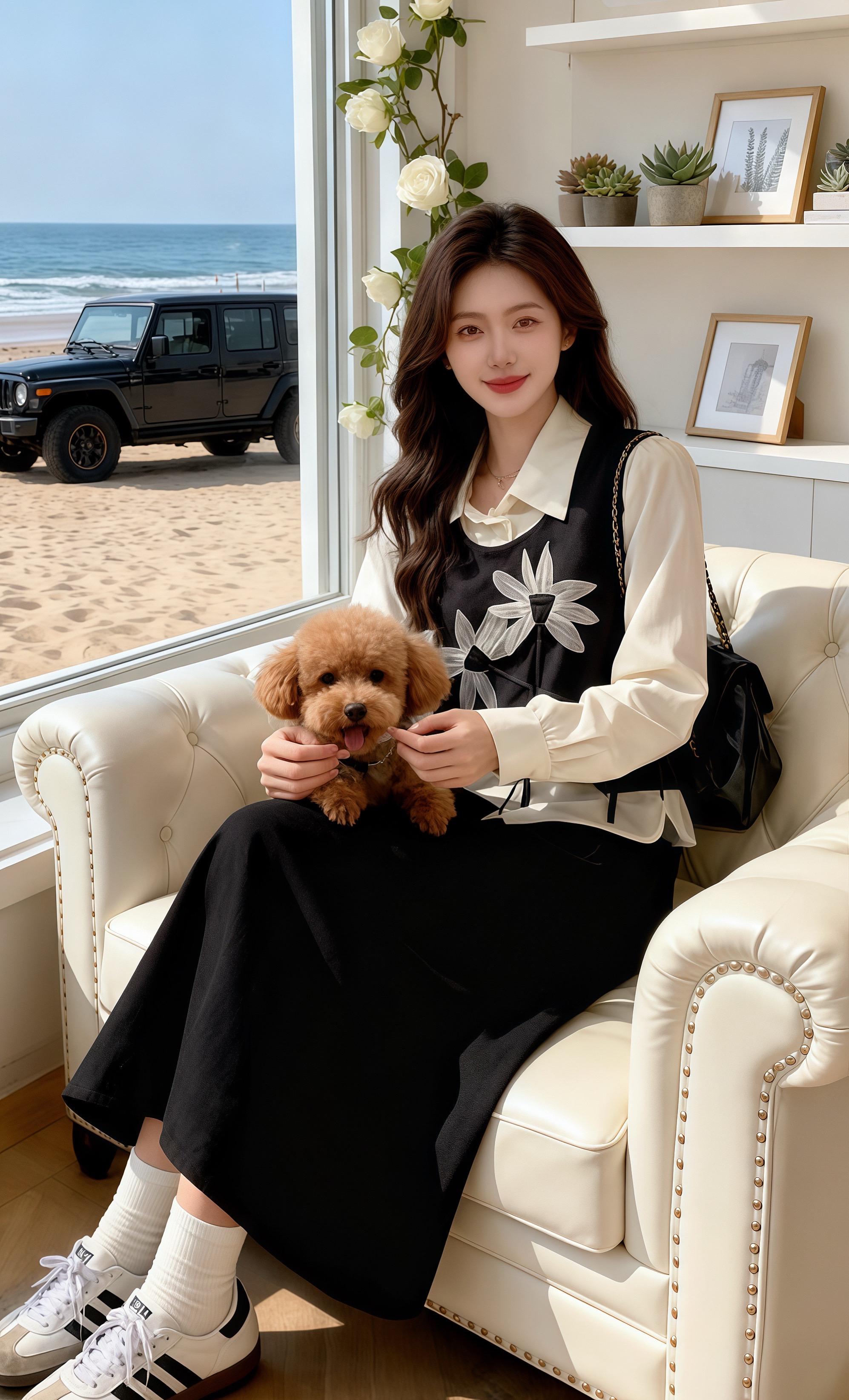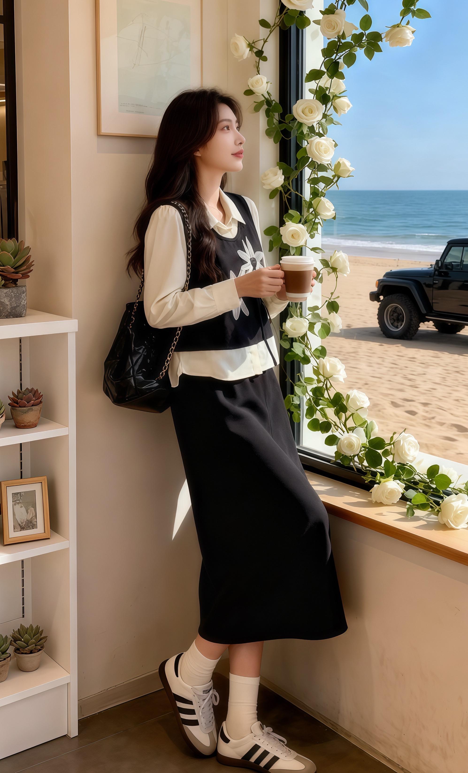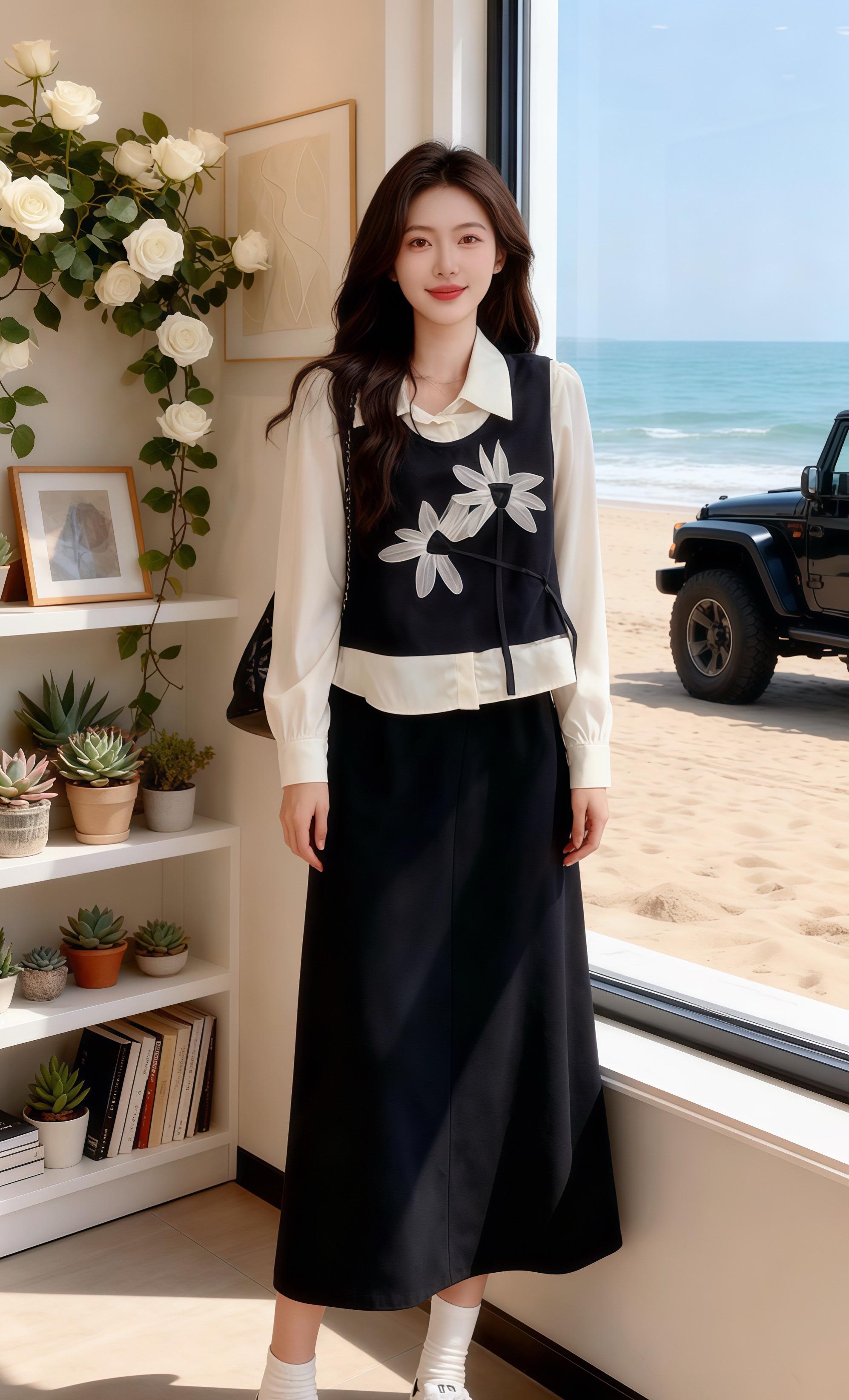 “在看什么?”皓明的声音从身后传来,带着刚从海边回来的海盐气息。他走近,目光落在许妍身上那套黑白穿搭上——米白衬衫衬得她肤色柔和,黑色马甲上的花朵刺绣精致又别致,长 skirt 垂坠感极好,连脚上的小白鞋都透着随性的时髦。