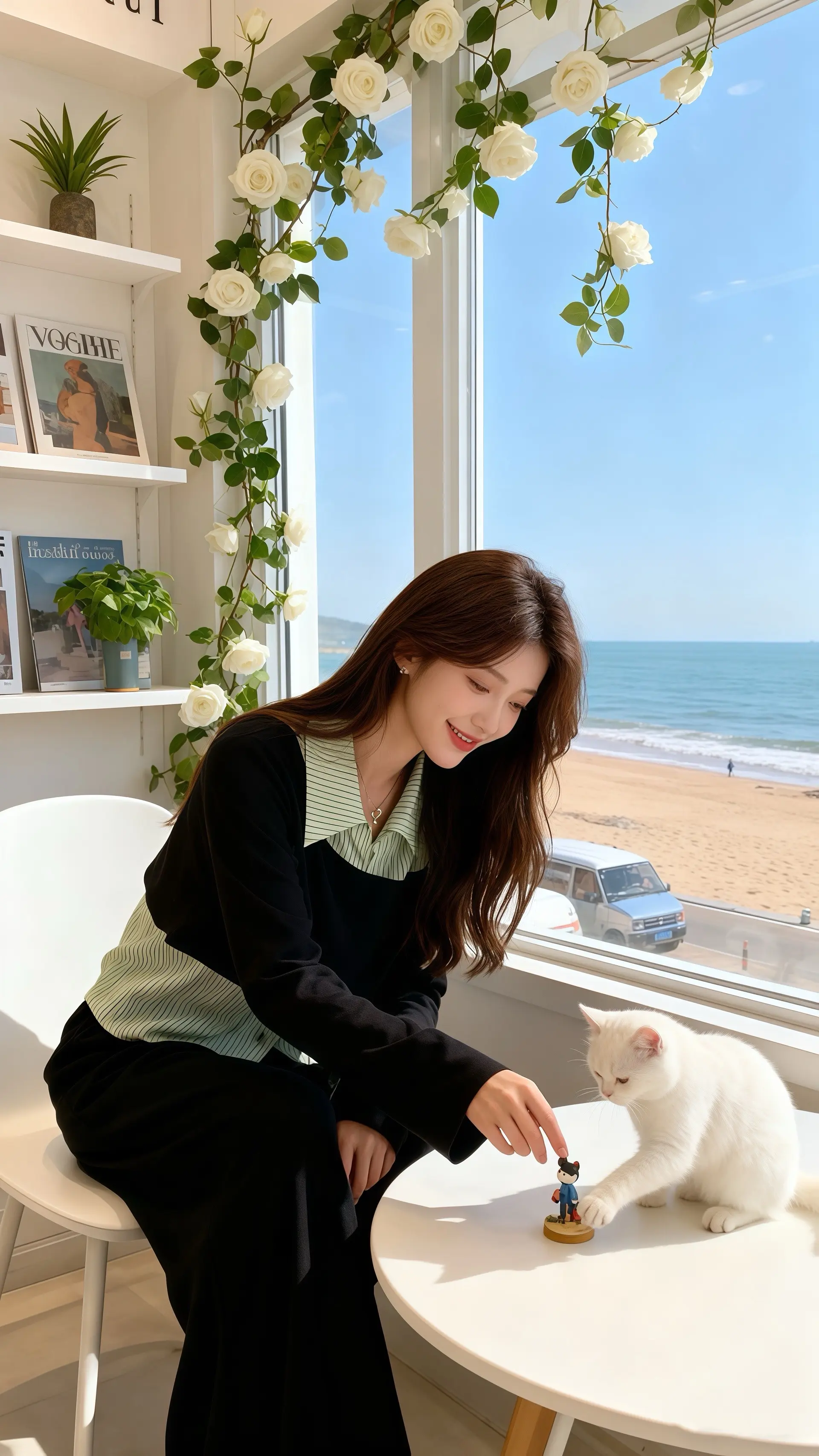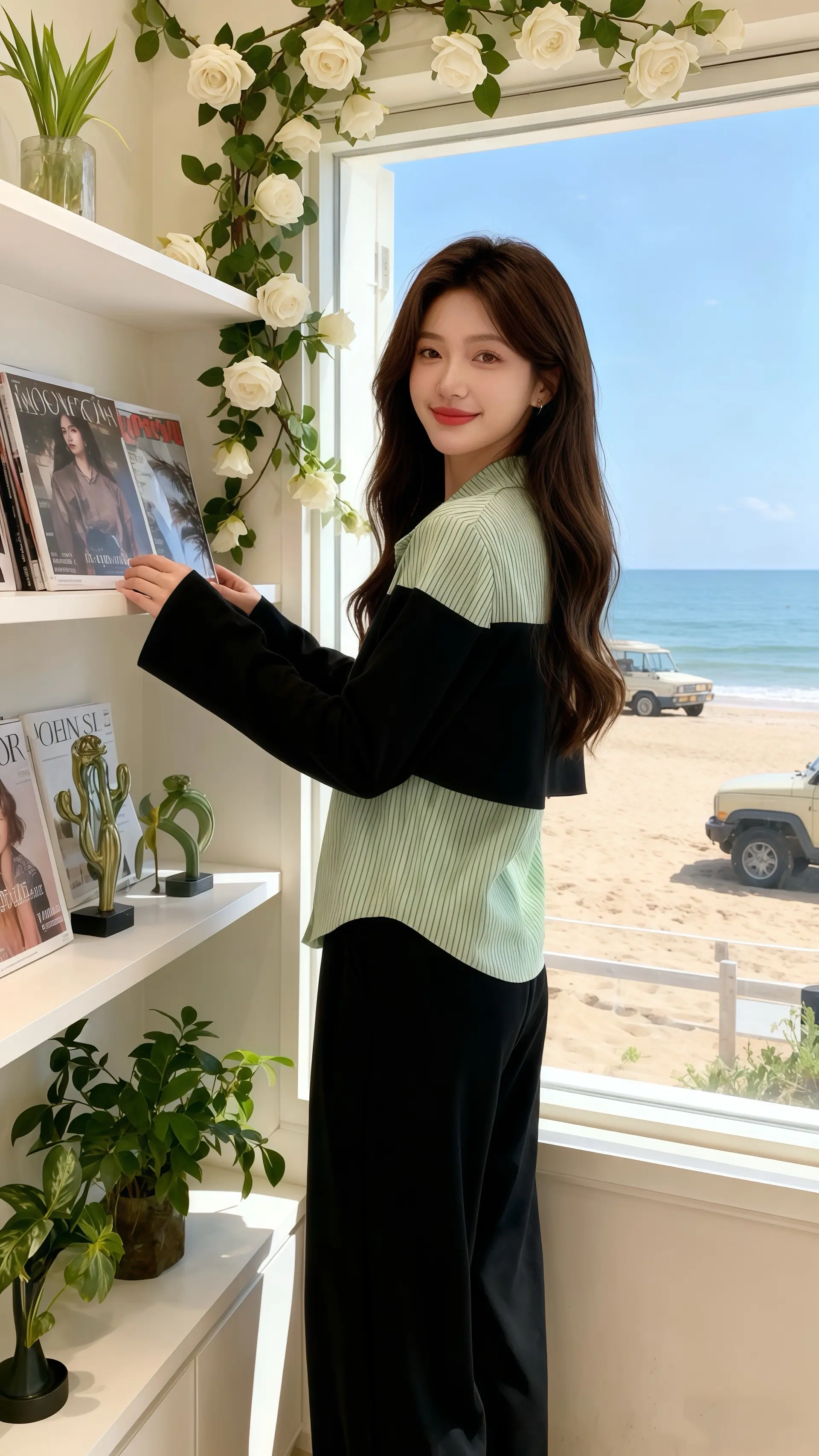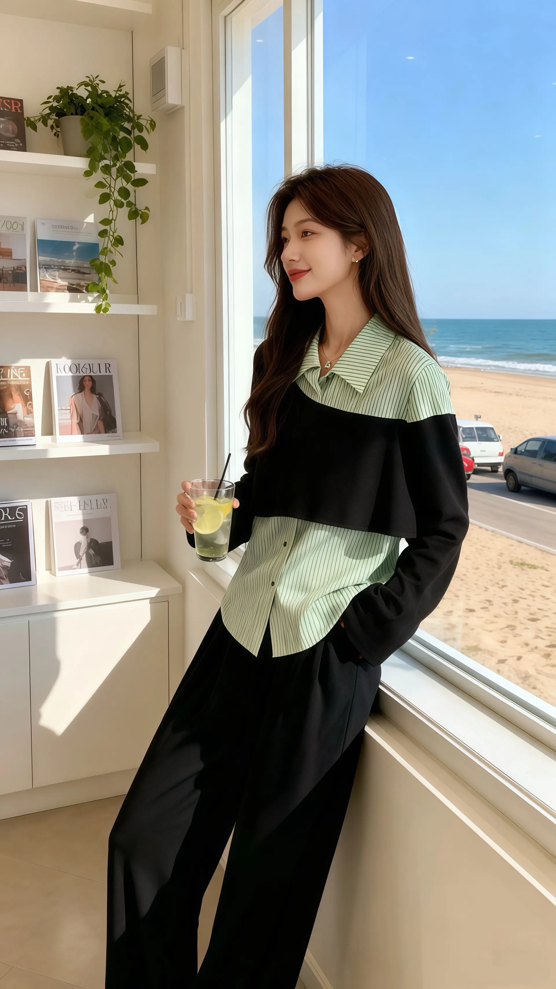 许妍站在临海的咖啡馆窗边,浅绿色条纹衬衫外搭的黑色罩衫,随海风漾起温柔的弧度。蒋亮推门进来时,目光便被她牢牢锁住。