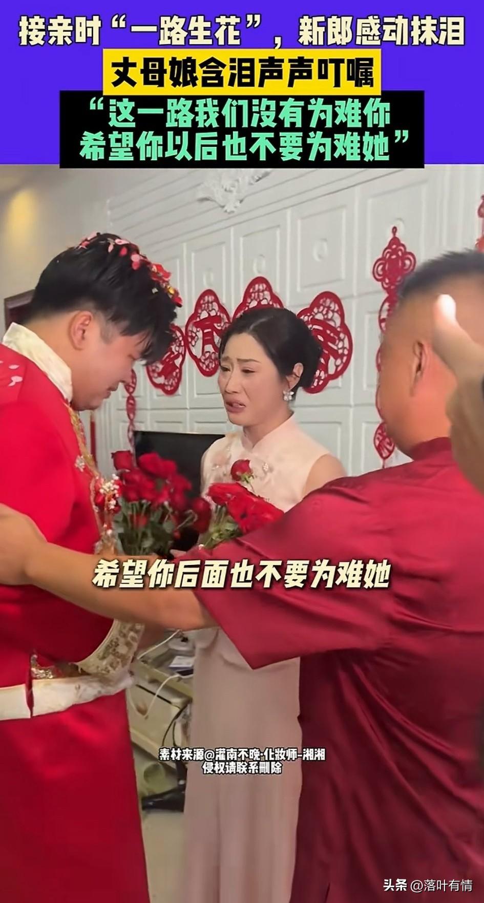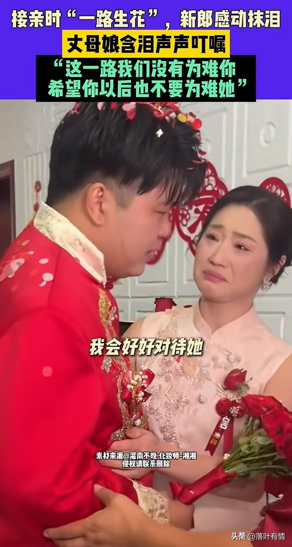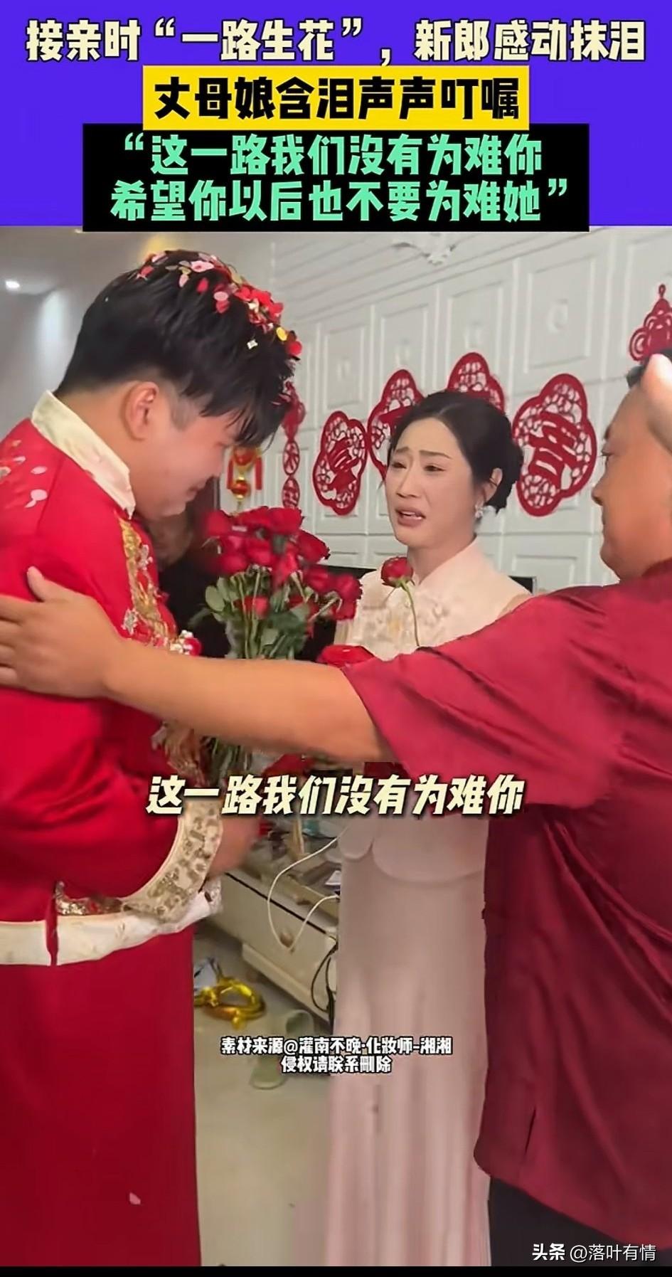 大喜的日子,新郎感动落泪, 因为他听着一路生花踏入了新娘家, 接亲的过程都很顺利, 看到了打扮漂亮的丈母娘, 丈母娘已经哭了起来, 或许是被气氛带动, 新郎也哭了起来, 丈母娘对小伙子说, 这一路我们没有为难你, 希望你后面也不要为难她, 老丈人也是拍打小伙子安慰他, 还没接到新娘两人先哭了起来, 小伙子擦干眼泪, 说了我会好好待她的, 和丈母娘来了个拥抱, 然后向着自己的新娘走了过去, 新娘开心不已, 她的母亲因为舍不得她已经哭成了泪人,老丈人只能安慰她, 大喜的日子可能是开心的哭泣吧! 大家对于丈母娘含泪交代女婿怎么看? 婚姻与家庭 婚礼暖心一幕 新郎 婚礼上新郎 婚礼泪崩 出嫁感人一幕