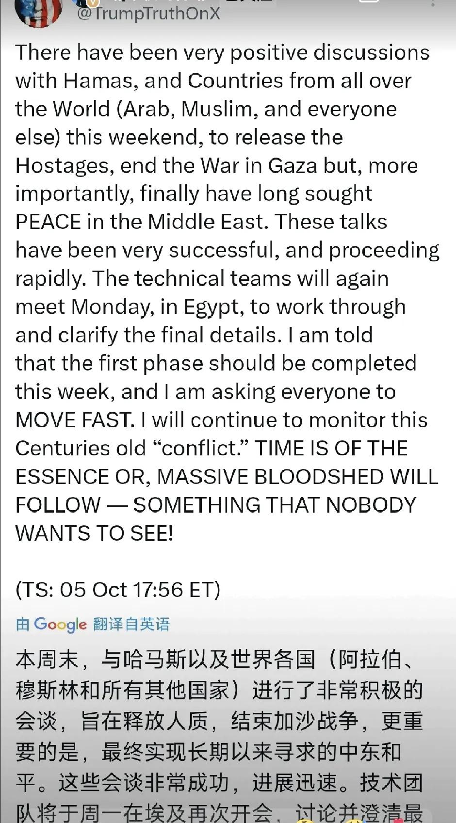 2025年10月6日,美国总统特朗普通过社交媒体宣称与哈马斯及多国就加沙冲突展开