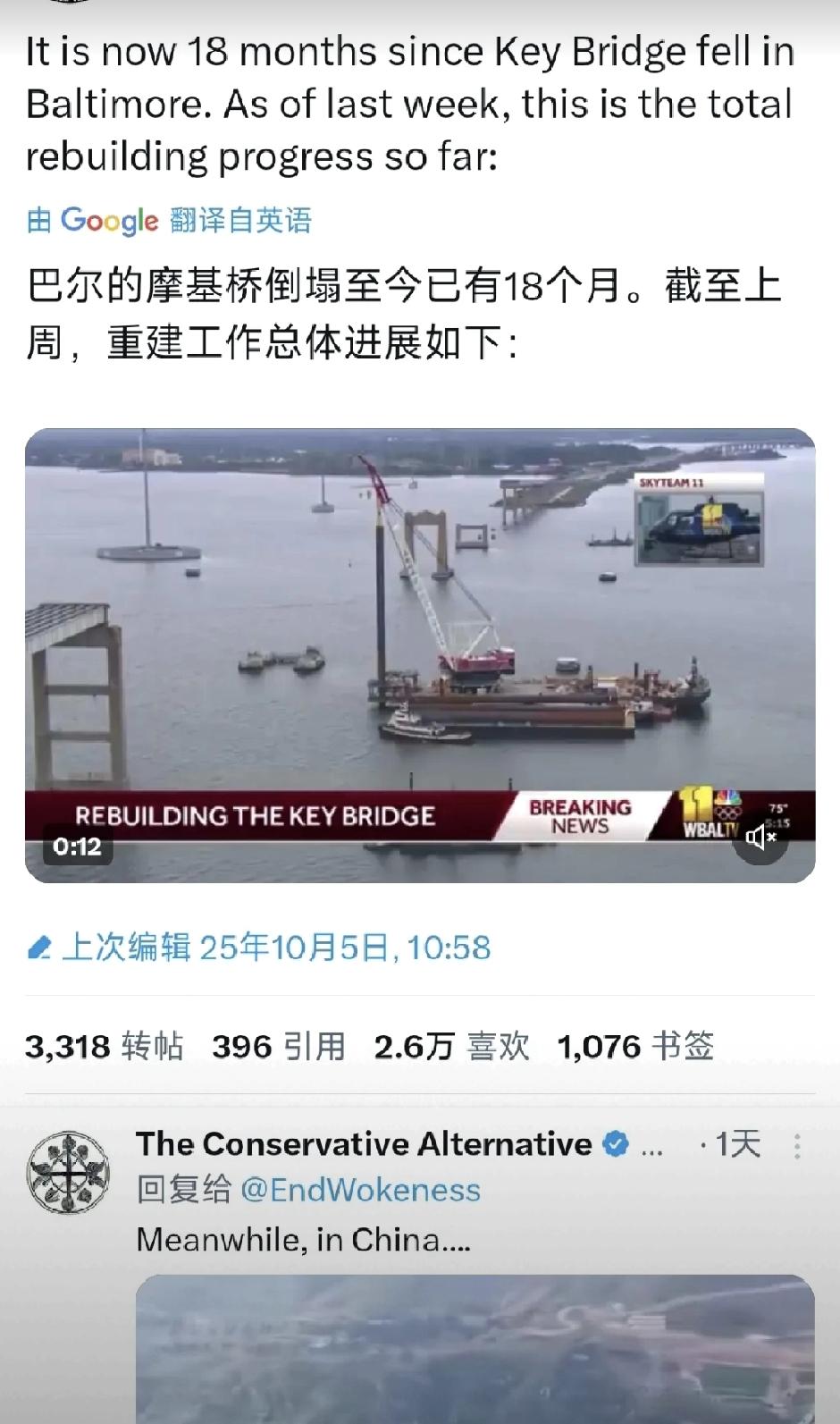 2024年3月美国巴尔的摩大桥被撞塌后,18个月过去修复进展缓慢——市政府预计2