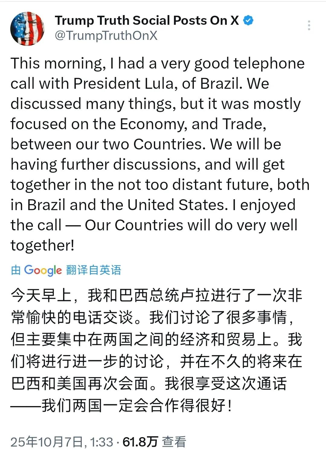欺软怕硬的主!美国总统特朗普与巴西总统卢拉通完电话后,特朗普10月7日发文写道:“今天早上,我和巴西总统卢拉进行了一次非常愉快的电话交谈。 我们讨论了很多事情,但主要集中在两国之间的经济和贸易上。我们将进行进一步的讨论,并在不久的将来在巴西和美国再次会面。我很享受这次通话我们两国一定会合作得很好!” 美国总统特朗普主动拨通了巴西总统卢拉的电话,这通跨越重洋的对话,一边是特朗普社交媒体上“非常愉快”的轻松表态,一边是卢拉条理清晰的诉求与邀约,表面和谐的交流之下,藏着两国从剑拔弩张到试探合作的复杂转折。 先看双方事后的公开回应,态度里的差异耐人寻味。特朗普在个人平台上只用寥寥数语勾勒通话轮廓,称两人重点讨论了美巴经济与贸易,约定未来会在巴西或美国再次会面,最后用一句“我们两国一定会合作得很好”收尾,语气里满是自信,却对具体议题避而不谈。 卢拉的回应则要具体得多,字里行间都透着务实。他明确提到通话时长恰好30分钟,还特意提及两人曾在纽约联合国大会期间有过“良好互动”,显然是想借过往的友好交集为这次通话铺垫氛围。 更关键的是,卢拉没绕圈子,直接点出了巴西的核心诉求:作为美国在商品和服务贸易中保持顺差的三个二十国集团国家之一,巴西希望特朗普能撤销对本国产品征收的40%高额关税,同时取消针对巴西官员的限制措施。 更值得关注的是,卢拉还主动抛出了一系列“会面邀约”:提议在马来西亚东盟峰会上与特朗普碰面,再次邀请对方出席在巴西贝伦举行的联合国气候变化框架公约第30次缔约国会议,甚至大方表示自己愿意亲自前往美国。 为了让后续沟通更顺畅,两人还交换了电话号码,建立了直接联系。这种主动姿态,既体现了卢拉推动美巴关系缓和的诚意,也展现出巴西作为拉美大国,在外交中寻求平等对话的底气。 可若把时间往回拨,谁能想到如今愿意坐下来通话的两人,此前曾有过激烈的言语交锋?就在不久前,特朗普政府对巴西的施压可谓步步紧逼,不仅对一名负责审理巴西前总统博索纳罗案件的法官实施制裁,还对巴西商品加征高额关税,这一系列操作,无疑是在美巴关系的伤口上撒盐。 要知道,博索纳罗与特朗普曾是政治上的“盟友”,特朗普政府对审理其案件的法官下手,明眼人都能看出其中的政治倾向,这对卢拉政府而言,既是对巴西司法主权的不尊重,也是一种变相的施压。 面对特朗普的强硬,卢拉也没选择妥协。他曾公开痛批特朗普的行事风格,直言对方“正试图当世界的皇帝”,语气里满是不屑;更放出硬话,强调“没有对美国的贸易,巴西也能生存”。 这句话可不是空口说大话,巴西作为拉美第一大经济体,拥有丰富的矿产、农业资源,近年来一直在拓展与其他国家的合作,从亚洲到欧洲,从非洲到拉美邻国,巴西早已不是只能依赖美国市场的国家。 那么,是什么让曾经针锋相对的双方,如今愿意放下分歧恢复高层接触?答案其实很简单:利益。对特朗普而言,巴西的战略价值不容忽视。作为西半球面积最大的国家之一,巴西在拉美地区有着举足轻重的影响力。 若能与巴西修复关系,不仅能为美国在拉美争取到一个重要盟友,还能在经济上打开新的合作空间——美国的农产品、能源、高科技产品,都渴望进入巴西这个庞大的市场。 对卢拉来说,缓和与美国的关系同样是现实选择。尽管巴西能在没有美国贸易的情况下生存,但“能生存”不代表“过得好”。美国仍是全球最大的消费市场之一,巴西的大豆、咖啡、肉类等优势产品若能重新顺利进入美国市场,对本国经济的拉动作用不言而喻。 撤销40%的关税,意味着巴西出口企业能降低成本、提高竞争力,进而带动就业、促进经济增长,这正是卢拉政府当前最需要的成果。此外,在气候变化、全球治理等议题上,美国的合作也不可或缺,卢拉主动邀请特朗普参加气候会议,也是希望借助美国的力量推动全球气候议程,同时提升巴西在国际气候合作中的话语权。 不过,这场看似积极的互动,并不意味着美巴之间的矛盾已经烟消云散。特朗普政府此前的制裁与关税措施,本质上是美国霸权思维的体现——习惯用施压和威胁的方式迫使其他国家让步,这种做法早已让不少国家心生不满。 卢拉虽然主动寻求合作,但也绝不会放弃巴西的核心利益,一旦特朗普在关税或制裁问题上迟迟没有行动,双方的矛盾很可能再次爆发。更不用说,特朗普“欺软怕硬”的行事风格在国际上早有定论,这次主动打电话。 或许是看到巴西的强硬态度后选择的妥协,可若后续巴西在某些议题上让步,他会不会再次变回此前的强硬姿态?这都是未知数。从更宏观的视角来看,美巴这次通话,也是全球多极化趋势下大国关系调整的一个缩影。 未来,美巴关系会走向何方?特朗普会不会真的撤销关税和制裁?两人约定的会面能否顺利举行?还要看后续的具体行动。