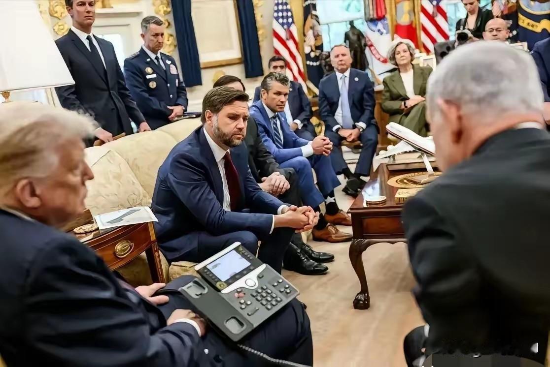 从这两张图片中可以看出以色列总理内塔尼亚胡在美国一众高层的注视下,这个电话打的虽