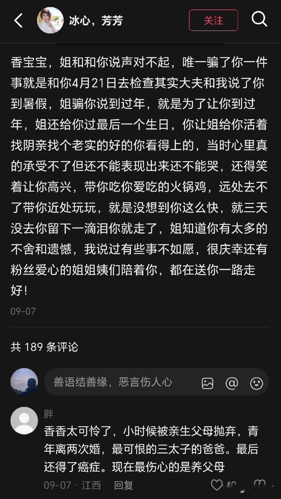近日,天津抗癌博主“香香”去世了,才35岁,姐姐重情义呀,知道离婚了,前夫不管不问,所以替她当主心骨!首先,对病情进行隐瞒了,因为肺癌晚期,4月份去检查,大夫就说,无药可治,最多也就活5个月左右,为了带命苦的妹妹体验人间乐趣,所以撒谎说,能活到年底,还早呢。 之后就抽出时间,把家务活扔给老公,孩子扔给婆婆,一起陪伴去周边旅游,尝遍美食,那一刻,仿佛就像回到了18.9岁,都没结婚时,过无忧无虑的日子。其次,妹妹的心愿就是想看看儿子,可是前夫就是不让给看,怕骨瘦如柴吓到孩子,姐姐知道后很生气,多次去沟通,调解,最后还是没能见面[泣不成声]。 9月5号,早上6点多,“香香”离开了,姐姐透露,没有什么痛苦,很安详,或许“香香”内心也感觉拖累了姐姐,所以在被疾病折磨最后一刻,即使疼痛如刀割,也忍住,面带微笑,让姐姐安心。哎,看完这个故事,忽然想生二胎了,父母不能陪伴一辈子,关键时候,还要有血缘关系的亲人在身边呀,除此以外,谁也指不上[流泪]。
