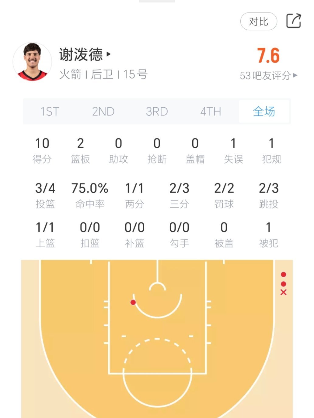 又进化了吗?申京今日出战17分钟,7投5中拿下19分5篮板6助攻2盖帽,正负值为