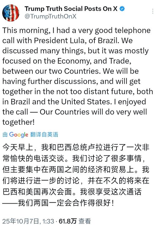美国总统特朗普与巴西总统卢拉通完电话后,特朗普今天(北京时间10月7日)发文写道