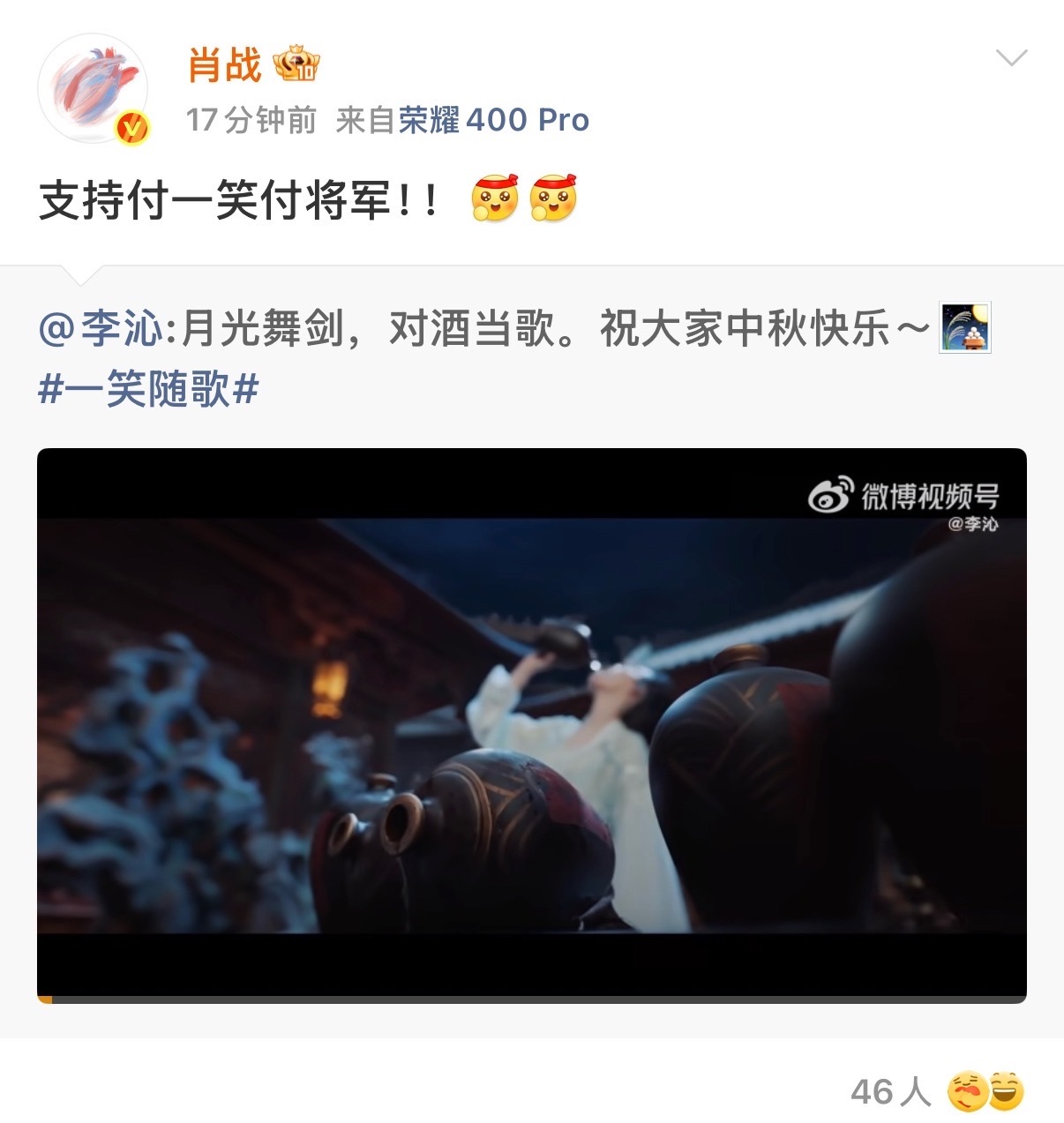 肖战转发支持李沁新剧一笑随歌肖战为李沁新剧一笑随歌打call
