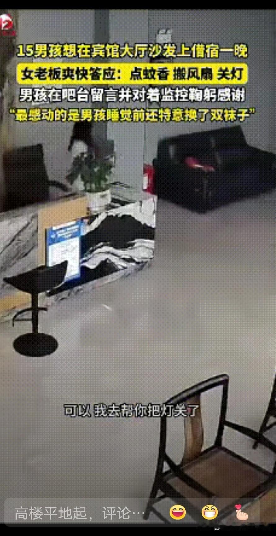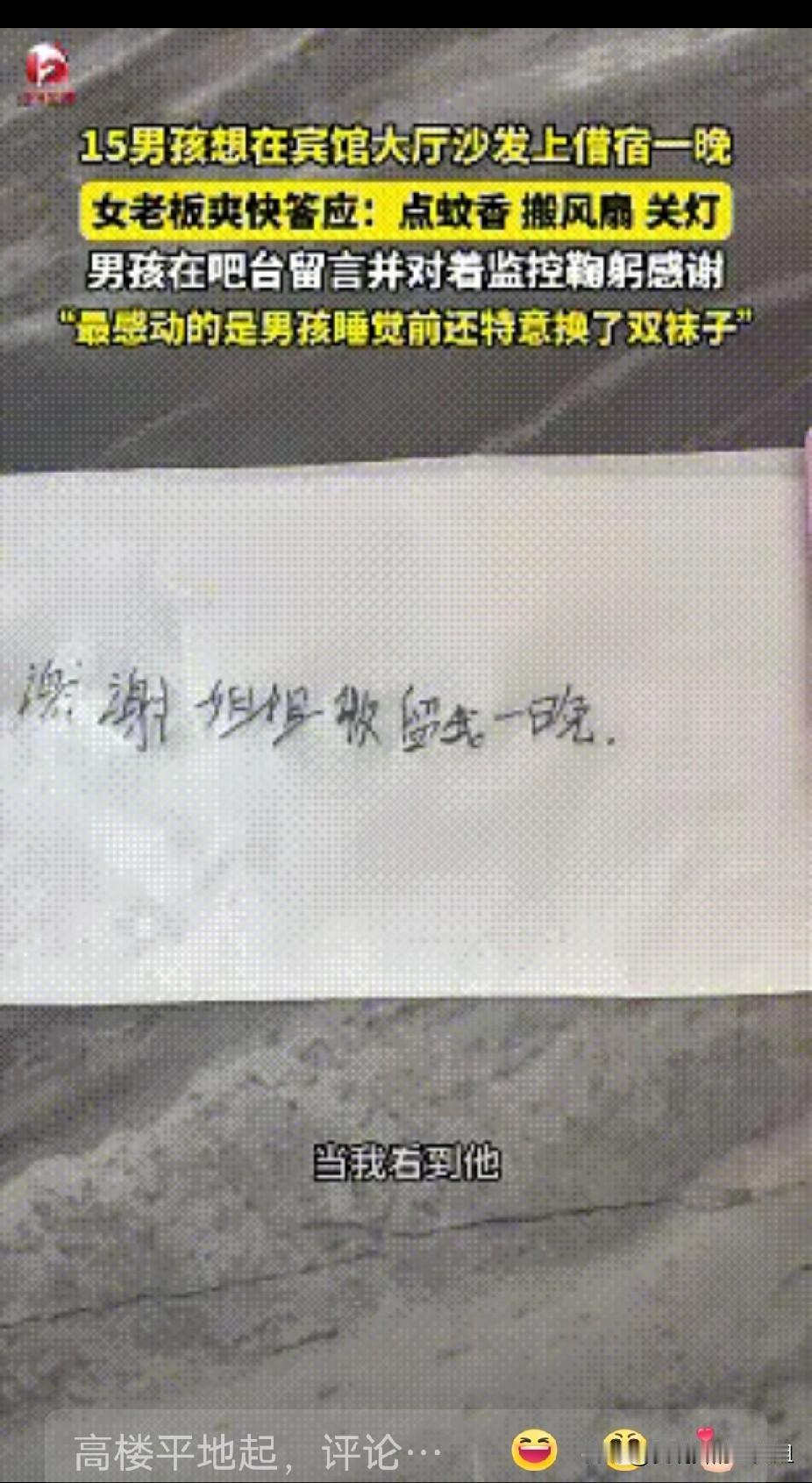 “看哭了!”湖南,15岁男孩想在宾馆大厅沙发上借宿一晚,女老板爽快答应后,担心他晚上睡不好,特意拿来风扇和蚊香,男孩第二天早上离开之前,在吧台给女老板留言说:“谢谢姐姐收留我一晚。” 那个留下纸条和零食的男孩,悄悄对着摄像头鞠躬的身影,像一颗温暖的石子投进生活的湖面。张女士翻看监控时眼泪怎么也止不住,她没想到凌晨两点那个怯生生徘徊的身影,心里装着如此厚重的感恩。男孩睡觉前特意换上干净袜子的小动作,留言时认真压好纸条的细心,这些细节让一次普通的善意收留变成了两颗善良心灵的无声对话。这个夜晚没有豪华的床铺,大厅沙发却成了城市里最温暖的角落,蚊香缭绕的烟雾仿佛在说:这个世界还没有那么冷漠。 不过这个故事里还有个被忽略的角落——那个直接带走自己孩子却留下陌生男孩独自面对黑夜的家长。想象一下那个场景:两个孩子刚刚碰面,家长突然出现带走了自己的宝贝,却没人问问这个从怀化跑来的少年该怎么办。夜幕降临,一个未成年人在陌生街道上游荡,该有多害怕才让他在凌晨两点鼓起勇气敲开宾馆的门。我们总说社会要善待孩子,可最先放下戒备的应该是成年人之间的默契,那个家长本可以多问一句“你家在哪”,或者至少帮孩子联系上家人。 宾馆老板的善举背后,其实藏着法律责任的灰色地带。根据未成年人保护法,旅馆接待未成年人时必须询问监护人联系方式、核实身份关系。张女士让男孩在沙发借宿固然温暖,但若严格按规矩来,她应该联系男孩父母或向公安机关报告。去年灵武市检察院就曾通过公益诉讼推动宾馆落实未成年人入住“五必须”规定,因为太多案例显示,违规接待的宾馆往往成为未成年人受害的温床。有14岁女孩在宾馆遭性侵的案例,就因为前台没登记身份也没报告,最终宾馆被判赔偿精神损失。法律这条硬杠杠,为的就是避免用孩子的安全赌人性的善良。 更值得玩味的是男孩那些下意识的举动——换袜子怕弄脏沙发,留纸条还压上零食。这些刻在骨子里的教养,比任何说教都更能打动人心。女老板点蚊香搬风扇的细心,男孩九十度鞠躬的郑重,构成了一场关于尊重的双向奔赴。在这个人与人之间充满警惕的时代,他们用最朴素的方式完成了信任的交接。也许真正的善良从来不是施舍,而是像这样彼此照亮。 这件事最动人的地方在于,它让我们看到规则之外还有人情在流动。法律条文是社会的骨架,但这些发自内心的善意才是让社会有温度的血肉。重要的是找到那个平衡点:既不能因为过度警惕而冰封了人与人之间最本真的关怀,也不能因一味心软而忽视了潜在的风险。就像检察官提醒的,未成年人独自住宿必须选择正规酒店并告知家长,这是保护自己的底线。但与此同时,社会也该给这样的温暖瞬间留一扇窗,让迷路的孩子能找到歇脚的屋檐。 各位读者你们怎么看?欢迎在评论区讨论。
