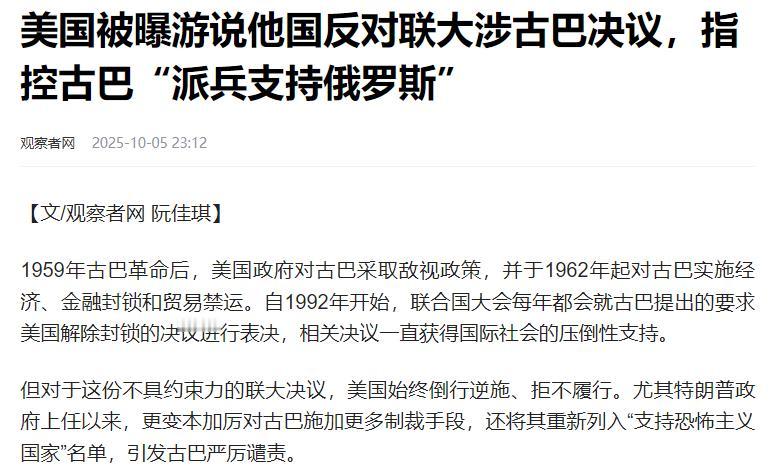 第二个出兵支援俄罗斯的国家出现了?5000名古巴战士在乌克兰参战? 当地时间10月6日,英国方面披露了一份美国国务院内部信息,内容显示美国总统特朗普正动员美国外交官,游说各国反对联合国一项呼吁解除对古巴数十年制裁和禁运的决议,而美国给出的理由是,指责古巴支持俄罗斯武装部队在乌克兰的战争,还公开了所谓古巴出兵的细节。 这说法看似有模有样的,实则漏洞百出,压根站不住脚。 先不说美国所谓的“出兵细节”毫无实据,古巴自始至终就明确坚守中立立场,根本不可能参与俄乌冲突。 古巴外交部早已公开否认参与支援俄罗斯在乌克兰的军事行动,强调雇佣军行为在古巴属于犯罪行为,并且已经依法打击了境内疑似存在的非法招募网络。 古巴驻华大使馆也发布过声明,明确表示古巴是国际法的捍卫者,始终反对使用武力,与乌克兰人民保持着友好关系,绝不会搅和到冲突之中。 就连俄罗斯驻华大使也仅表示双方在就相关传闻进行沟通,并未确认任何具体的参战人数或官方合作,所谓“5000名古巴战士参战”纯属无稽之谈。 其实美国心里门儿清这说法站不住脚,它真正的目的根本不是关心俄乌局势,而是不想让联合国解除对古巴的制裁。 要知道,联合国大会每年都会投票呼吁美国取消对古巴几十年的禁运,2024年那次投票,187个国家都赞成解除,就美国和以色列投了反对票。 眼看国际社会大多都不支持自己的制裁政策,美国就想出编造“古巴参战”谎言这招。 美国国务院内部的电报都显示,他们在动员外交官到处说这个事,核心就是想游说其他国家在投票时要么弃权要么反对,甚至电报里还直接说“投反对票最好,但弃权或者不来投票也成”。 这套路美国以前就常用,之前还编过“中国在古巴建间谍设施”“哈瓦那综合征是古巴用秘密武器搞的”这些瞎话,本质上都是为了给继续制裁古巴找理由。 从把古巴列进“支持恐怖主义国家”名单,到加强金融和旅行限制,美国每一步操作都带着明显的政治算计,根本不是为了什么“国际安全”,就是想通过硬压来左右古巴的局势。 说到底,所谓“古巴出兵支援俄罗斯”不过是美国为了维持制裁造出来的舆论工具,既没有古巴官方的任何证据,也经不起事实推敲。 国际社会早就看清美国这套说谎的把戏了,自然不会被这种故意编出来的说法给骗了。