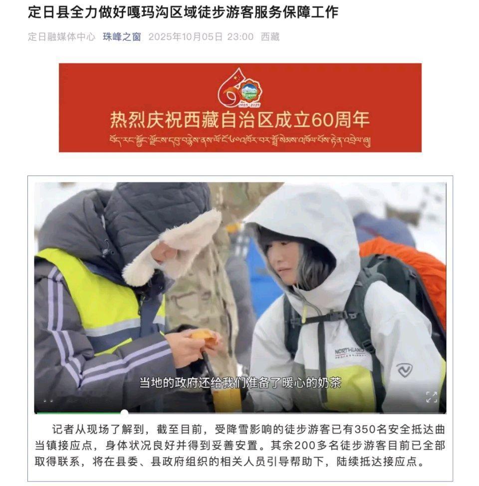 10月5日,西藏海拔4900余米的珠峰东坡营地突降暴雪,近1000人被困。当晚23时,350名徒步游客安全抵达接应点,200多名也都取得联系。到6日11时,此前到达的游客已妥善安置,后续人员也被安全转移到周边酒店。 亲历者董先生回忆,他们4日进山还没问题,中午开始雨雪交加,晚上天气恶化,凌晨雨大得让人睡不着,还得扫帐篷上的积雪。他说这是强对流天气,雪大得根本挡不住,周围还有云对地闪电,全身都结冰了,真是死里逃生。还好救援及时,大家身体状况都不错。
