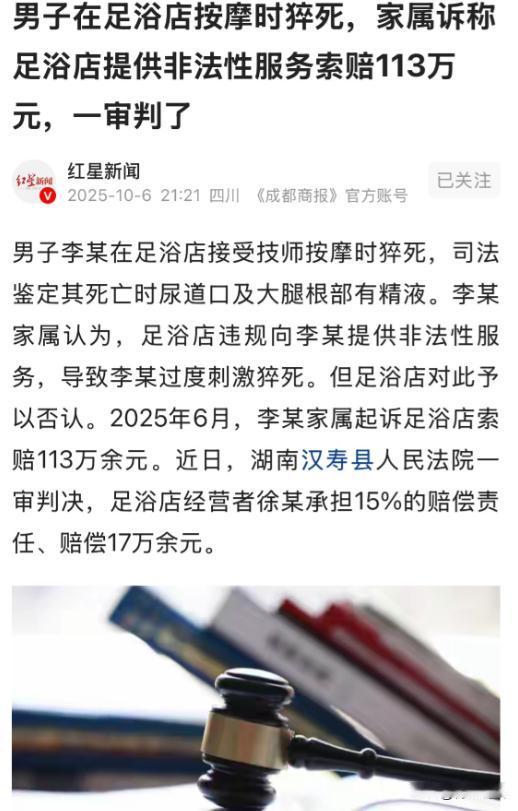 湖南汉寿,李某凌晨去足浴店按摩时选了68号女技师,1小时20分钟后,女技师发现李某异常,疑似没有了呼吸,送医抢救无效后离世,司法鉴定李某有基础病,当时尿道口和大腿根部有精液。家属认为足浴店有违规经营的项目导致李某离世,索赔113万,法院这样判。 2025年3月19日凌晨0点,李某却辗转难眠。他起身出门,径直走向徐某经营的足浴店。当时徐某不在,员工朱某热情接待了他。 李某环顾四周,提出先洗个澡再按摩。朱某应下,很快叫来四五个技师让他挑选。李某最后选定了68号的杨某。 杨某手法娴熟,手指在李某背上轻轻按压、揉搓,力度恰到好处。李某全程闭着眼,脸上满是享受,偶尔发出舒服的轻哼声,几乎没怎么说话。 凌晨1点20分左右,杨某轻声说先生按摩结束了。可李某依旧躺在按摩床上,一动不动,像是睡着了。 杨某怕出意外,赶紧喊来前台的邓某。邓某走到李某身边轻声呼唤,又轻轻碰了碰他的肩膀,却发现李某身体有些僵硬,呼吸也十分微弱。 邓某急忙通知店长刘某,又让朱某拨打急救电话,15分钟后,检查发现李某没了自主呼吸和意识。 他们在足浴店紧急抢救10分钟,可李某情况依旧没有好转,还是没能救过来。 司法鉴定结果也出来了,显示李某生前有心 脏 病 变等基础病,死亡时尿道口和大腿根部还有精液。 李某家属认为足浴店肯定提供了非法性服务,导致李某情绪激动才离世的,于是向足浴店索赔113万。 足浴店老板徐某说李某的家属没有证据证明有非法服务,而且发现李某异常后,他们第一时间就做了他们该做的。 双方协商多次都没有结果,李某的家属将足浴店告上了法庭。 1,足浴店是否尽到安全保障义务?若未尽到,会受到什么样的处罚? 足浴店作为公共经营者,依据《民法典》规定,有义务为消费者提供安全的消费环境,这包括配备必要的安全措施、张贴警示标志等。 足浴店既没有配备相应的安全措施,也未张贴警示标志。 而且员工发现李某异常后,没有及时采取有效的急救措施,错过了最佳抢 救 时间,这明显未尽到安全保障义务。 根据《民法典》的规定,宾馆、商场、银行、车站、机场、体育场馆、娱乐场所等经营场所、公共场所的经营者、管理者或者群众性活动的组织者,未尽到安全保障义务,造成他人损害的,应当承担侵权责任。 所以,足浴店需对李某的死亡承担一定责任。 2,李某自身的行为,是否有过错呢? 李某作为成年人,明知自身有基础病,却在凌晨时分前往足浴店消费。 从常理来看,凌晨人的身体状态相对较弱,此时去足浴店按摩,对自身安全防范明显不足。 根据《民法典》规定,被侵权人对同一损害的发生或者扩大有过错的,可以减轻侵权人的责任。 李某自身的基础病是导致其死亡的重要因素,且其对自身安全未尽到足够注意义务,存在重大过错。所以,李某需对自身死亡结果承担主要责任。 3,精 液与李某的离世是否存在关系呢,如果无法举证会如何处理呢? 司法鉴定显示李某死亡时尿道口和大腿根部有精液,但未说明精液产生原因。 家属认为足浴店提供非法性服务导致李某情绪激动而离世,却未能提供相关证据证明精液与李某的离世存在因果关系。 根据《民事诉讼举证》规则,谁主张谁举证,家属应承担举证不能的责任。 如果家属无法举证,就不能认定足浴店存在提供非法性服务的行为,也不能将此作为足浴店承担责任的主要依据。 最终,判决足浴店承担15%的责任,赔偿李某家属17万元,其余90%的责任由李某自身疾病导致死亡承担。 信源:红星新闻 2025.10.6