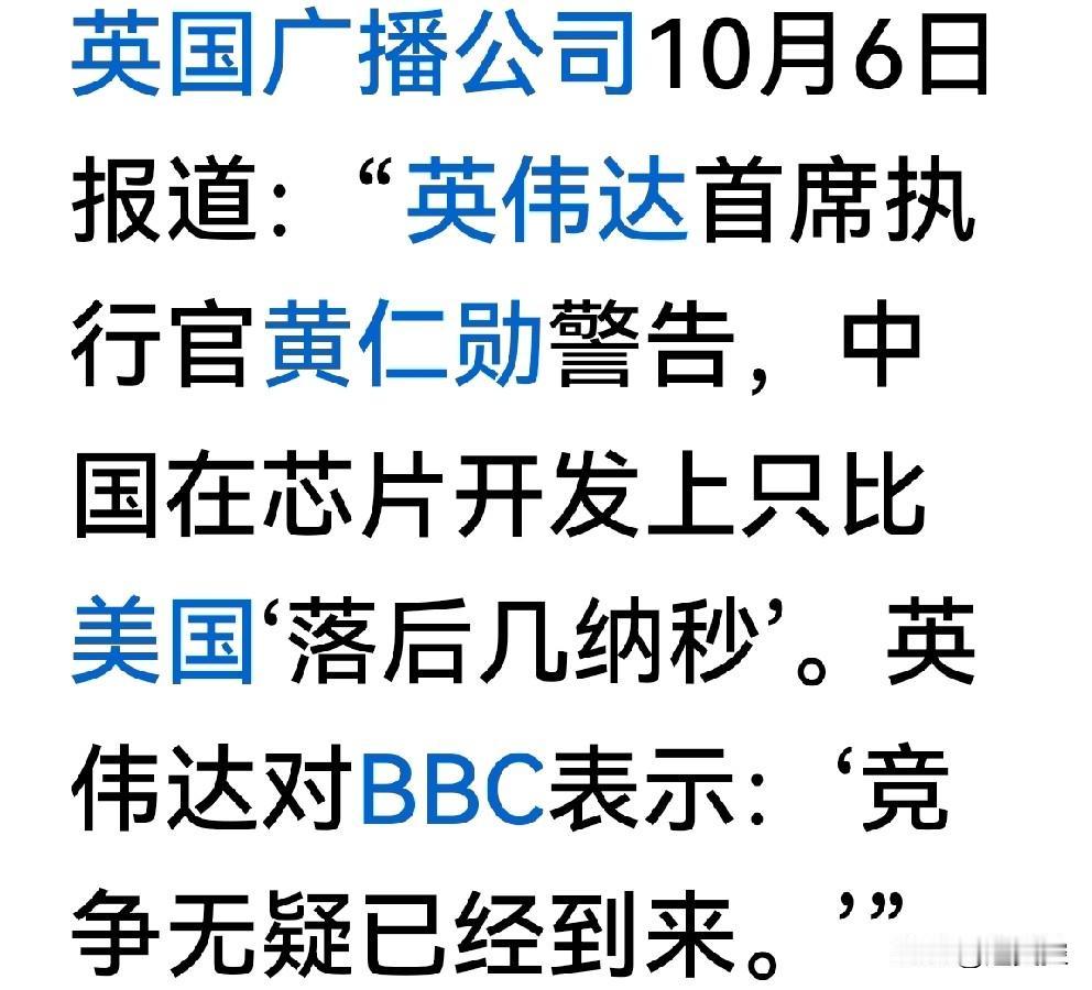 请确认眼神,他就是黄仁勋,我相信很多人知道他,经常往来于美国中国和台湾省,卖芯片的美籍华裔企业家。他说的一句话,中国芯片开发只比美国落后几纳秒。他对BBC表示竞争无疑已经到了。 他错了吧,竞争早就到来,调查他卖给我们的芯片“缺斤短两”的事儿,意味着不再依赖“卡脖子”的美国芯片。中国人在有些关键领域或者关联行业向来就是实干巧干,实现弯道超车的事儿我们多了,否则我们很难与霸凌行为作斗争,也很难有底气说“让大家度过一个愉快祥和的双节”。科技方面的迎头赶上有目共睹,我觉得文化方面吃大亏,必须纠正。新自由主义思潮侵蚀了多少年了,一些社会问题就是随着经济大潮涌动,被文化入侵淹没了。必须旗帜鲜明地发出自信表达,用文化浸润一代又一代的中华儿女,才是永不衰退的中国“芯”!