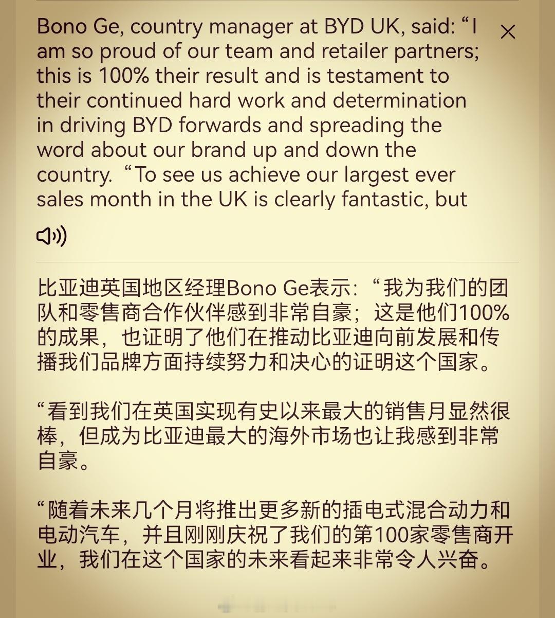 比亚迪英国国家经理Bono Ge表示:截止9月底,我们已开业100家零售门店;未来几个月我们将推出更多新的插混车及纯电车!