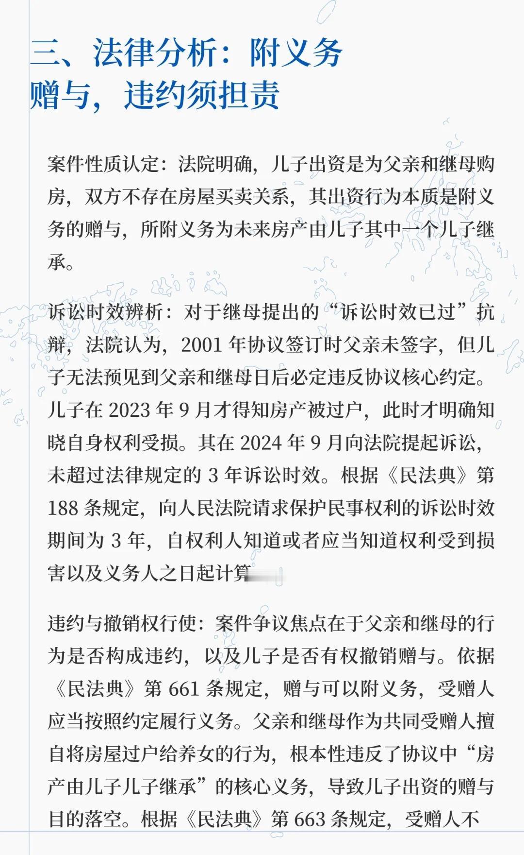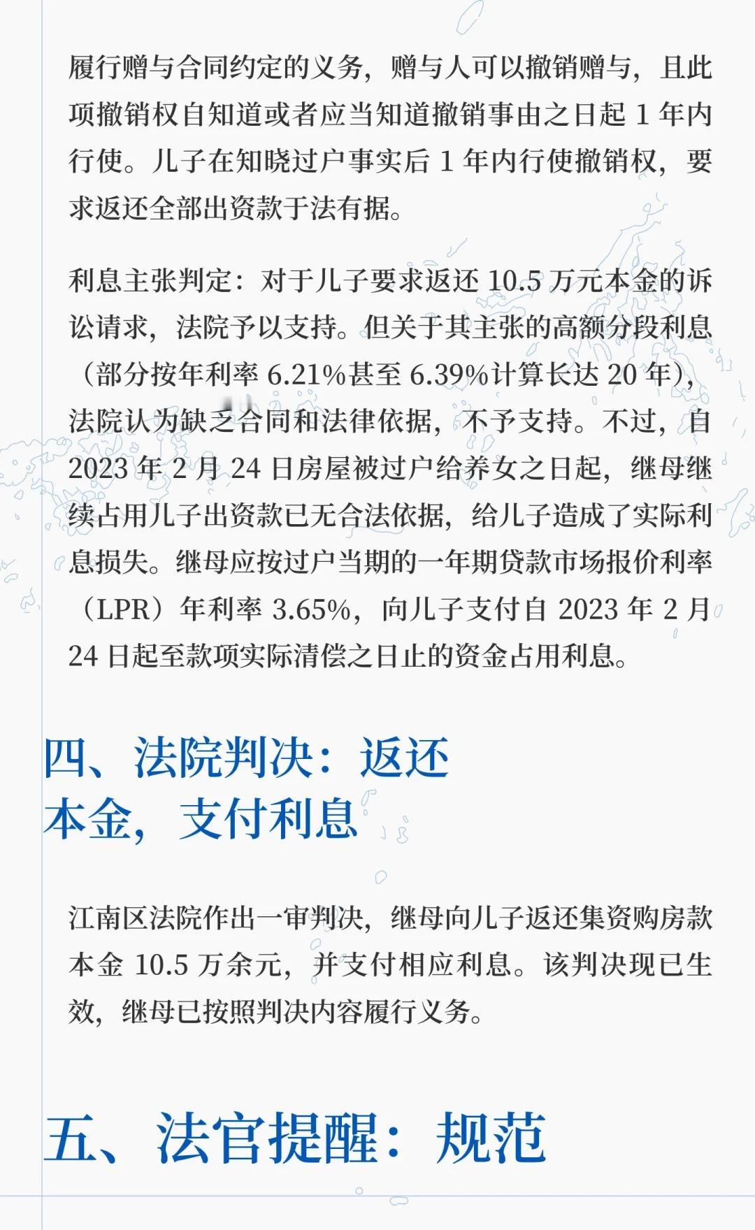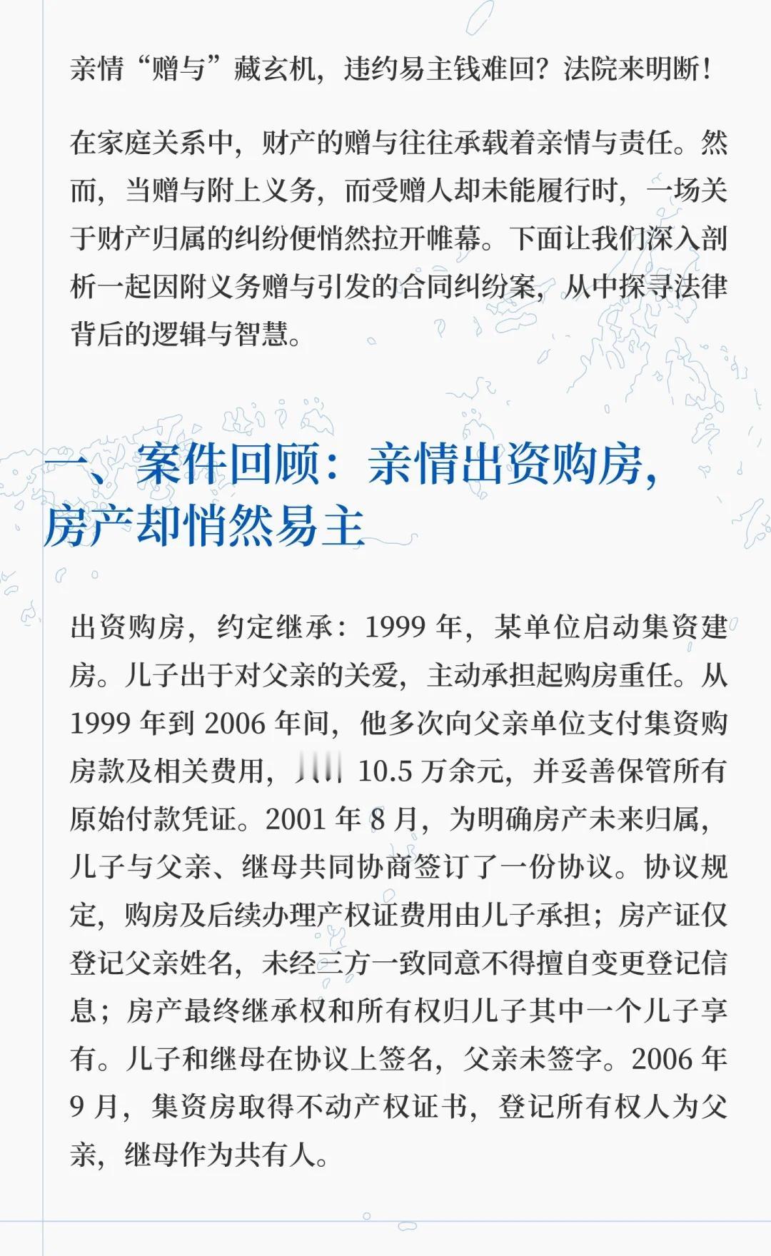 亲情“赠与”藏玄机,违约易主钱难回?法院 儿子出资购房并附义务赠与房产给父亲,父亲和继母擅自过户给养女,儿子起诉要求返还出资款并支付利息。法院认定赠与有效,父亲和继母违约,判决返还本金并支付利息。 法律服务 律师咨询 律师 北京律师 法律咨询 赠与 附条件赠与 附义务赠与协议 赠与无效
