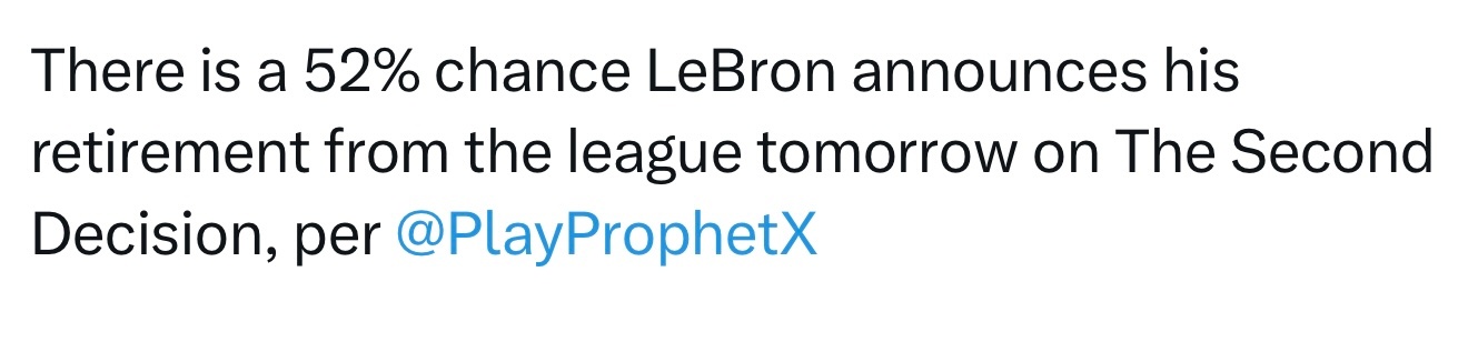 美国专业机构预测,詹姆斯明天在节目中宣布退役的概率为52%。