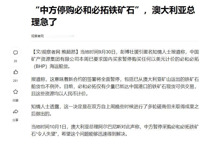 中方各大港口如临大敌,严查必和必拓铁矿石,一律不予接收!看来,中方是铁了心要给澳大利亚立个规矩。近期,国内各大买家被要求停止购买,必和必拓任何以美元计价的海运货物,甚至连已在运输途中的货物,也在此次限制范围内。 说起来,必和必拓这些年在对华铁矿石贸易里,真是把“嚣张”俩字刻进骨子里了。作为澳大利亚最大的矿企,它攥着中国高品位铁矿的主要供应渠道,2025财年国际矿价明明跌了19%,它倒好,反手把长协价往上提了15%,硬生生涨到109.5美元/吨。 更气人的是,不管国际上人民币结算的趋势多明显,它就是死咬着美元不放,仿佛吃定了中国离不开它的铁矿。可别忘了,中国每年要进口超10亿吨铁矿石,近七成来自澳大利亚,以前是没找到更稳的替代源,才让它有恃无恐地躺着赚钱,现在咱们早不是没选择的样子了,这口气自然不能再咽。 谁也不是傻子,中国早就在悄悄布局替代供应了。几内亚的西芒杜铁矿去年年底已经投产,一年能出1.2亿吨铁矿;跟巴西淡水河谷签的长期协议,每年也能稳拿5000万吨;俄罗斯更是抓住机会补上来,通过铁路运输加人民币结算,对华铁矿石出口量一下子涨了80%,直接成了咱们第三大铁矿来源国。 就拿2025年前8个月的数据说,澳大利亚铁矿在中国的进口占比,已经降了12个百分点,有这些靠谱的“备胎”在,咱们才有底气跟必和必拓摊牌。你不配合,有的是别家愿意跟咱们好好做生意。 这一禁,最先扛不住的就是必和必拓。它对华年出口量差不多1.2亿吨,占自己总出口量的六成,这可是实打实的“现金牛”业务。消息一出来,必和必拓的股价当天就跌了8%,市值一下蒸发了200多亿澳元,公司内部都开始紧急开会想办法。 澳大利亚整个国家也跟着慌,要知道铁矿石出口占它GDP的10%还多,财政收入、工人就业都指着这行当吃饭,现在中国这边一停,澳方财政收入直接少了一块,不少铁矿工人都开始担心要失业,这可不是小事。 更讽刺的是澳大利亚政府那副前后不一的样子。今年7月的时候,总理阿尔巴尼斯还专门访华,说要加强中澳经贸合作,结果刚回去没多久,自家的必和必拓就因为涨价、拒用人民币结算把中国惹毛了,这脸打得,简直没地方搁。以前澳大利亚总跟着美国喊“供应链去中国化”,觉得能拿捏住中国的铁矿需求,现在才发现,真正被拿捏的是它自己,这种“搬起石头砸自己脚”的操作,说出去都让人笑话。 其实中国这招打得特别精准,就是捏准了澳大利亚的“七寸”——铁矿石是它的经济命脉,而中国是它最大的买家。现在必和必拓已经开始松口,有消息说10月就要重启和中国的谈判,十有八九得接受咱们提的“浮动价格+人民币结算”,毕竟再耗下去,它的铁矿只能堆在港口生锈,损失可不是一点半点。 而且这不仅是针对必和必拓,更是给其他想在贸易上跟中国耍心眼的国家提个醒:别觉得中国好欺负,咱们有能力护着自己的利益,不管是之前的稀土,还是现在的铁矿石,谁想卡中国的脖子,最后只会断了自己的财路。 顺带提一嘴,这次还有个隐形的突破——人民币国际化。中国明确说了,想继续跟必和必拓合作,要么用人民币结算,要么就暂停交易,现在已经允许必和必拓用人民币计价的现货清关。这一步走得特别妙,不声不响就把人民币推进了国际大宗商品交易里,打破了美元的垄断。就像俄罗斯,现在跟咱们做铁矿石生意,人民币结算占比都到45%了,照这趋势,以后会有更多国家愿意用人民币做贸易,这才是真正的改写游戏规则。 当然,澳大利亚也不是没路可走,关键是得认清现实。首先得让必和必拓放下身段,别再端着架子,接受浮动价格和人民币结算,不然失去中国市场,它在全球矿企里的地位只会越来越低。其次澳大利亚也该想想产业转型了,总不能一辈子靠卖铁矿过日子,过度依赖一种资源,早晚要出问题,趁现在还有机会,发展发展高端制造业、新能源这些产业,才能真正稳住经济。 最关键的是,别再跟着美国搞政治操弄,贸易就是贸易,扯什么“国家安全”都是借口,中国买铁矿是正常的商业行为,澳大利亚倒好,之前还限制中企投资铁矿,这种“吃饭砸锅”的事干多了,谁还愿意跟它合作? 说到底,这一场铁矿石博弈,根本不是简单的贸易纠纷,而是中国在国际经济秩序里争取话语权的缩影。澳大利亚现在的处境,就是给所有想压制中国的国家提了个醒:在全球化时代,单边制裁、技术封锁那套早就不灵了,想跟中国玩硬的,最后只会反噬自己。中国这几年从稀土反制到现在的铁矿石布局,一步步证明了咱们有能力、有智慧应对各种挑战,以后在国际舞台上,咱们的腰杆只会越来越硬。 大家不妨想想,必和必拓要是真低头接受人民币结算,会不会带动更多澳企跟着改?澳大利亚政府要是还不调整对华政策,后续还会有哪些行业受影响?这背后可不只是生意,更是咱们国家实力的体现,你们觉得澳大利亚这次能撑多久? 参考资料:观察者网