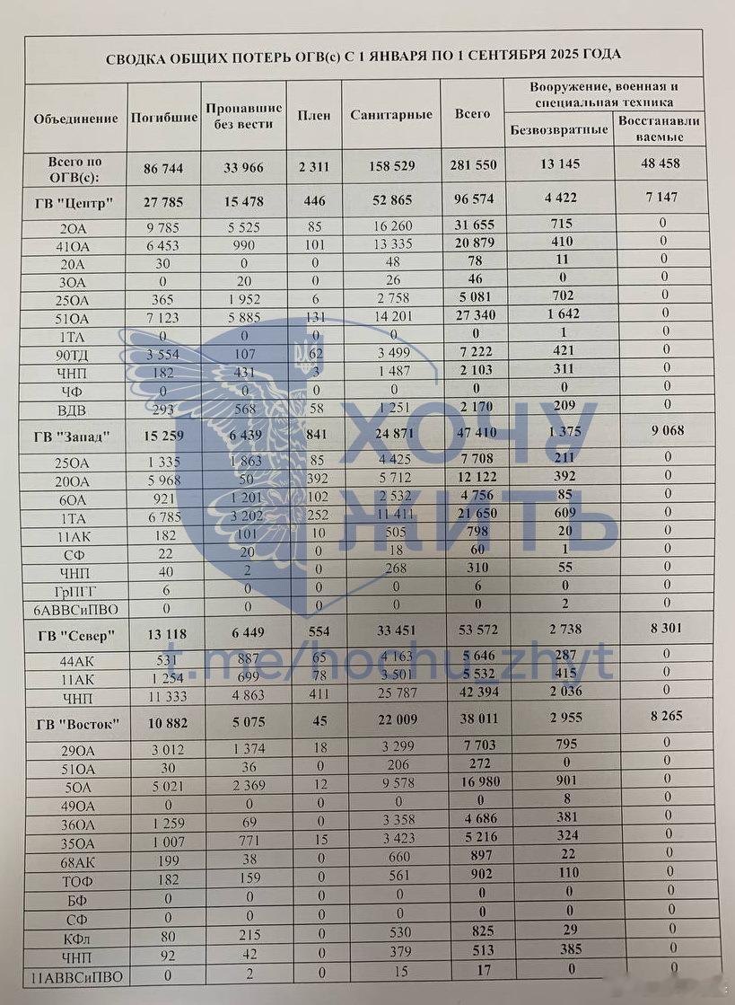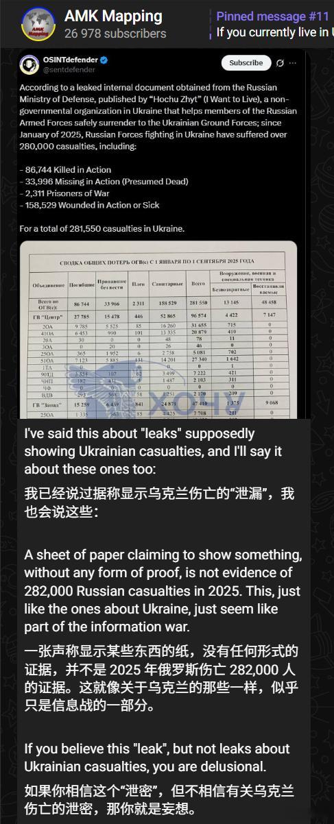 一个不知道哪儿冒出来的信源hochuzhyt今天上传了两张照片,据称是关于 2025 年前八个月俄罗斯军队损失的俄罗斯军事秘密文件。许多不同的推特账户,其中大多数隶属于北大西洋渔业组织,,试图将这份文件称作实际情况。还有一位自称是前乌克兰士兵的人甚至写道,乍一看“这些文件看起来是真实的”。