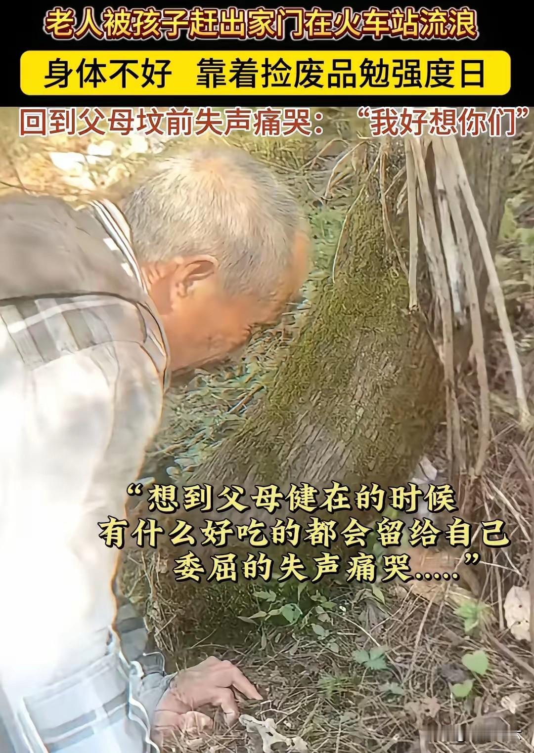谁说养儿能防老?82老人身体不好,遭到儿子嫌弃被赶出家门,在火车站靠捡破烂为生。老人来到父母坟前,哭诉着自己的委屈:娃不管我,我这几年生活太苦了。他想起父母在的时候,总是把最好吃的留给他吃。可惜在这个世界上,最疼他的人已经不在了。有网友说:看到老人绝望的眼神,我泪目了,看来有儿子也不一定能防老!更有网友感慨:一母能养十儿,十儿难养一母。 这事儿听着就让人心寒。老人把儿子拉扯大,掏心掏肺付出一辈子,到头来连个安稳晚年都换不来。 做儿子的也太不是东西了,自己亲爹都能狠心赶出门,这哪还配当个人? 老人蹲在火车站捡破烂的时候,心里该有多绝望。养儿防老这句老话,现在看来说不准还真靠不住。 当父母的总是把最好的都留给孩子,可孩子成家立业后,反倒把老人当成累赘。这世道怎么了? 孝顺这俩字难道就只写在课本里?老人蹲在父母坟前哭诉那段最扎心,世界上最疼他的人早就不在了。 现在连亲手养大的孩子都嫌弃他。这种被至亲抛弃的痛,比吃不饱穿不暖更折磨人。 说到底啊,把晚年全押在孩子身上风险太大。现在年轻人压力也不小,可这不能成为不赡养父母的借口。 再难还能比父母当年一把屎一把尿把你拉扯大更难?政府也该多建些养老机构,让那些无依无靠的老人有个着落。指望不上孩子的时候,社会总得给条活路。 各位读者你们怎么看?欢迎在评论区讨论。
