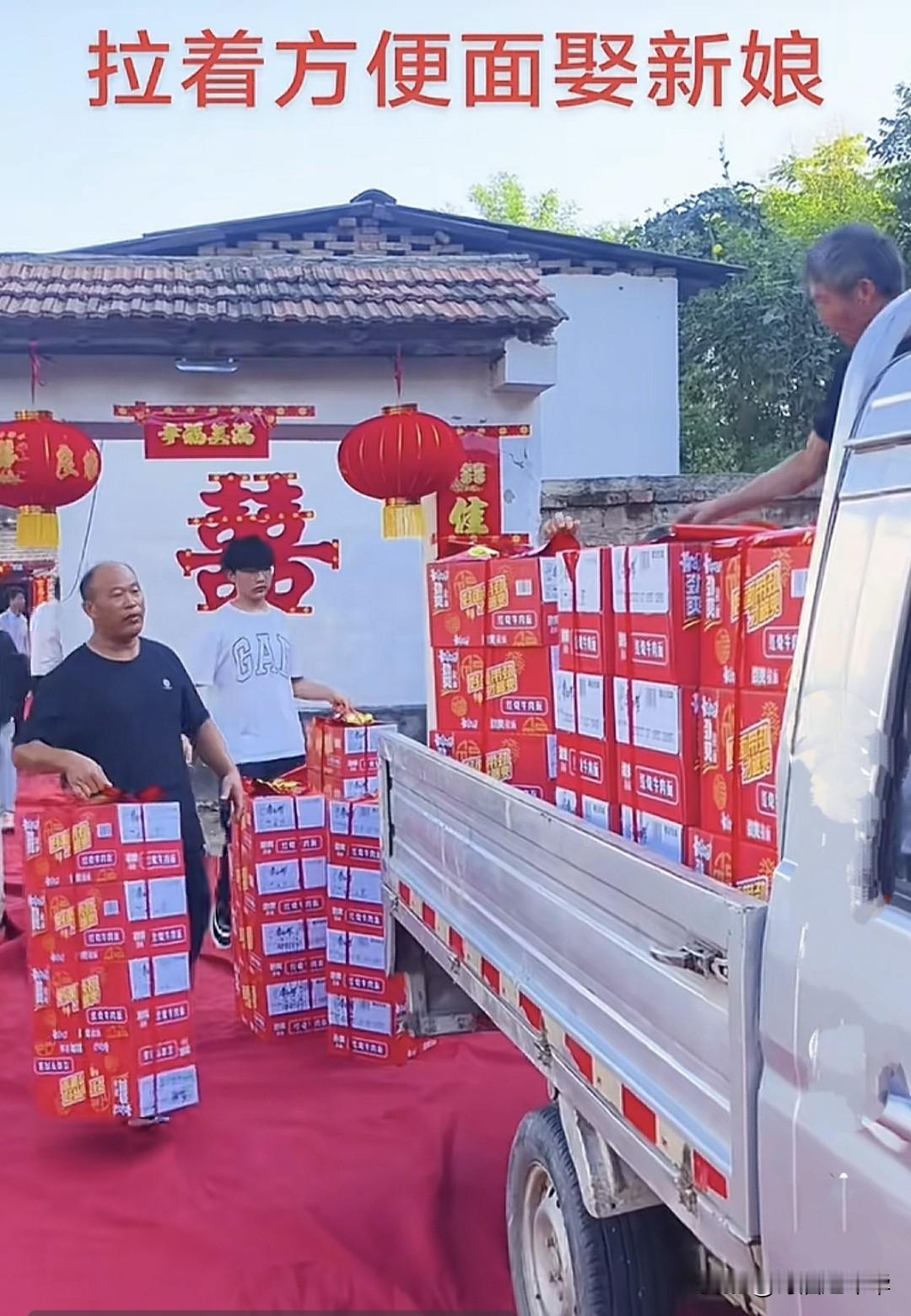 吃不完,根本吃不完。河南赈灾式订婚,几百箱方便面、酒水、饮料和熟食,外加一头整猪,必须用货车拉着浩浩荡荡的开到丈母娘家门口,而丈母娘家也会提前找好人在门口等着卸车。这是女方家几辈子没吃过饱饭吗。