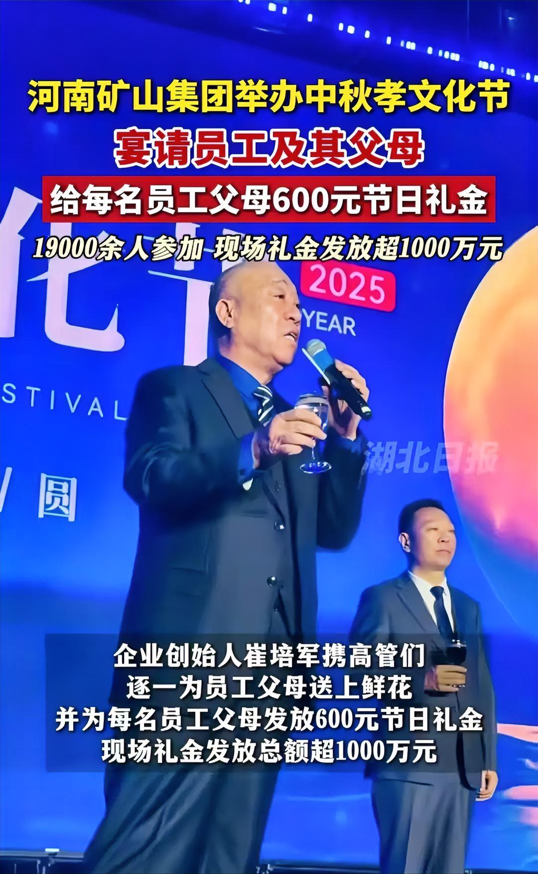 大家不要力捧“崔培军” 人家不需要 崔培军河南矿山董事长,被大家亲切的称为“国民好老板”,低调做人,高调做事,唯一的爱好“发钱”,并不是企业利润有多高,而是以“民”为本。 特意查了一下,人家企业员工7000多人,每年都愿意拿出一个亿的利润来分给员工,这还不算每逢佳节的礼品奖金,只要是重大的节日,必做的就是“发钱”慰问,不光是员工,家属也同样如此。 10月4日-5日,更是举办了第十二届中秋孝文化节,宴请了员工及家属和合作伙伴19000多人,为每位员工的父母献上600元的礼金和鲜花,当天礼金发放的金额超1000万元,真是当之无愧的“国民好老板”。 而且“崔培军”个人还在做慈善事业,每年都会拿出100万资助那些贫困的大学生,2018年10月更是被评为“中国好人榜”。 种种好事不为博流量,也不是为了增加曝光度,一心一意的创办企业,真心实意的爱戴员工。 我想说,这么好的老板我怎么没遇到呢?
