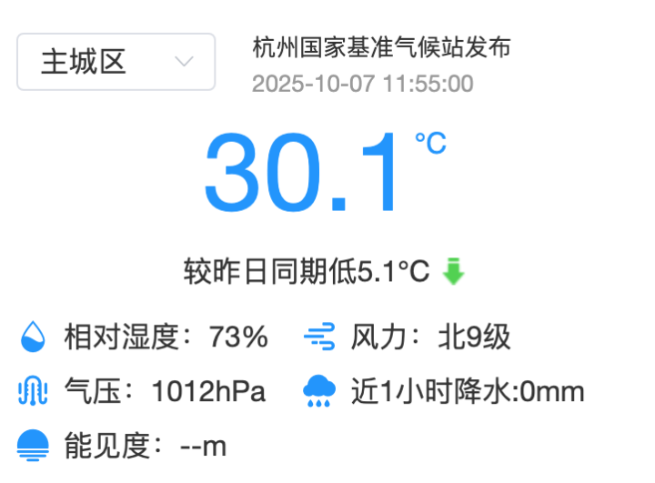 相比昨天,今天出门,大家有没有感受到清爽了一些?上午11时55分,主城区才刚刚突破30℃,比昨天同期降了5.1℃。按照目前的天气趋势,明天和后天,在冷空气持续渗透的助力下,气温还会呈现缓慢下降的态势,预计最高气温将维持在31~32℃左右。虽然降温幅度不大,但对于经历了长时间高温的杭州人来说,已经是难得的“凉快”了。