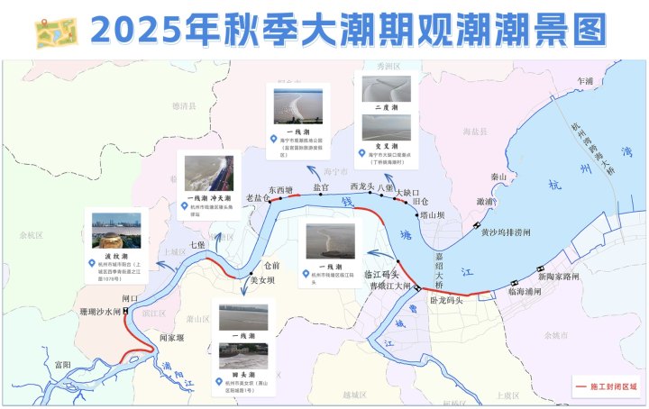 天气小姐姐再次提醒大家,在现场观潮时一定要听从工作人员的指挥,不要到没有安全防护措施的堤塘附近,以及丁字坝或水上码头、护岸的盘头、沙龙上观潮。不要越过防护栏到海塘外平台、护坡、河滩、丁字坝等上面去游玩,更不要在夜间、潮汛期等危险时段下江。涌潮到来时,人切莫与潮争道,不要相互拥挤,避免发生人被潮水卷入的伤亡事故。