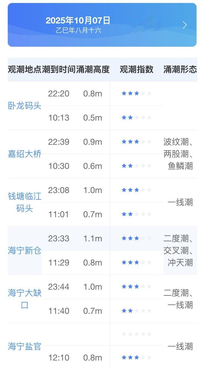 钱塘江潮形态丰富多样,常见有一线潮、交叉潮、冲天潮、波纹潮及回头潮等。一线潮气势磅礴,潮形整齐有序;交叉潮变幻莫测,形成条件较为苛刻;回头潮则猛烈折返,冲天潮汹涌拍岸。如果你计划去海宁盐官观潮,还请记得去“海宁公安”的微信公众号提前申领电子《观潮通行证》。