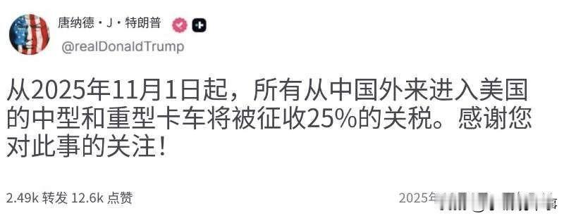 🇺🇸⚡️ — 美国总统特朗普宣布对所有进入美国的中型和重型卡车征收25%的关税。 特朗普增关税 特朗普关税方案 特朗普美国关税 特朗普加增关税 美国全面关税 美国新全面关税 美征收关税