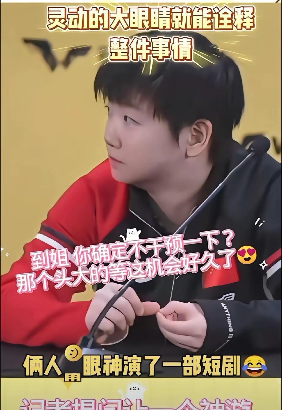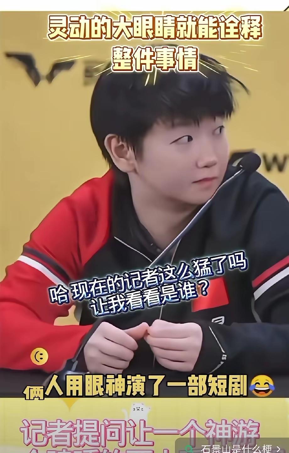 要是周到没有干预,你们猜王楚钦能说出什么来,是不是现在全网已经炸了! “石景山”事件都知道了吧? 石景山小剧场也都看了吗? 虽然已经结束了,还是回味无穷。 莎莎灵动的大眼睛就能诠释 莎宝自己听到的也是孙颖莎。 现在的记者这么猛了吗 让我看看是谁? 俩人用眼神演了一部短剧。 记者提问让一个神游 一个打瞌睡的俩人瞬间清醒了! 王楚钦:8年了,终于有人要问这个问题了,这是要提前官宣吗?我心底得打一下草稿! 莎莎:到姐,你不干预一下子吗?头哥等这个机会可是好久了! 周法海:发挥啥呀,发挥,问的是石景山,石景山。 有点可惜,被周法海打断了,要不然头大的嘴里能说出什么来呢?