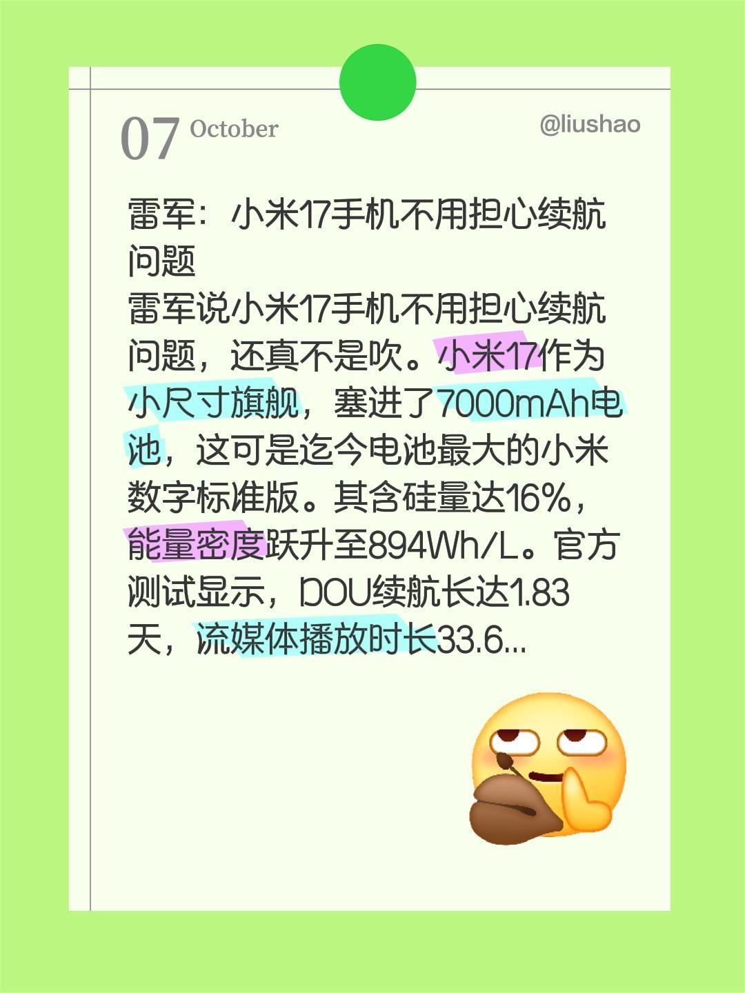 雷军:小米17手机不用担心续航问题 雷军说小米17手机不用担心续航问题,还真不是吹。小米17作为小尺寸旗舰,塞进了7000mAh电池,这可是迄今电池最大的小米数字标准版。其含硅量达16%,能量密度跃升至894Wh/L。官方测试显示,DOU续航长达1.83天,流媒体播放时长33.6小时,续航焦虑直接被解决。 而且,它的金沙江电池寿命超长,2000次循环后容量仍≥80%,用五年续航依旧强劲。再加上小米澎湃电池管理系统,高低温环境续航都出色。现在小米17已发售,起售价4499元,还有四种配置可选,加量不加价,这续航表现,还要啥自行车!