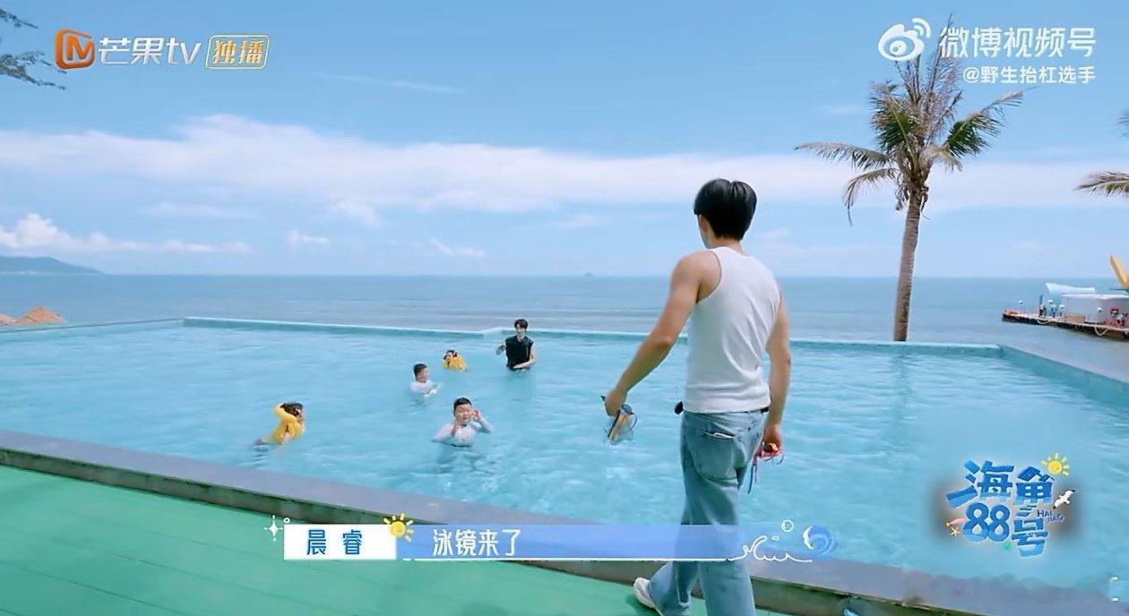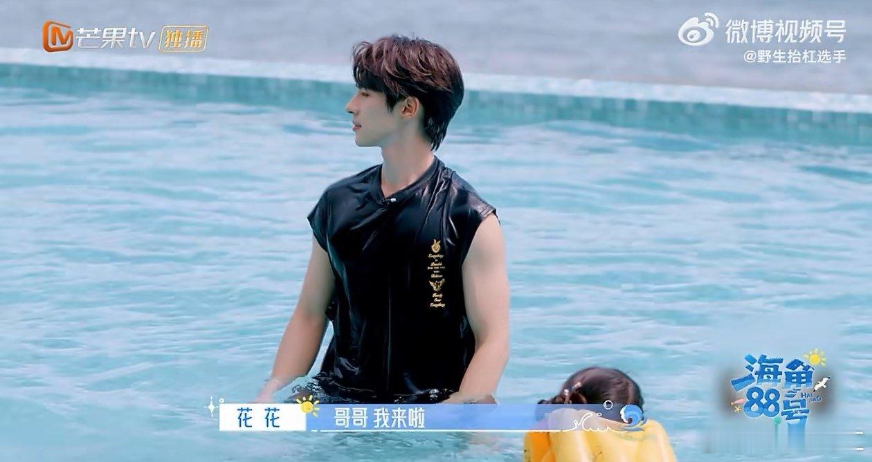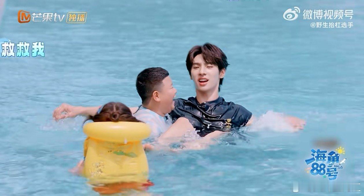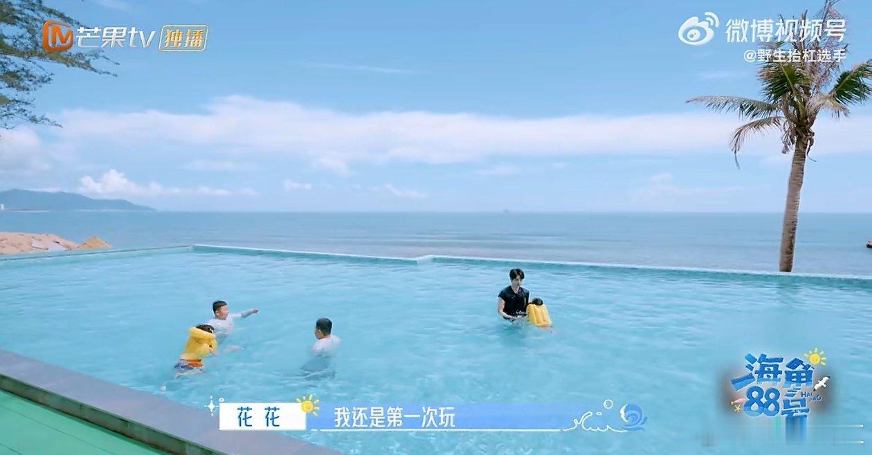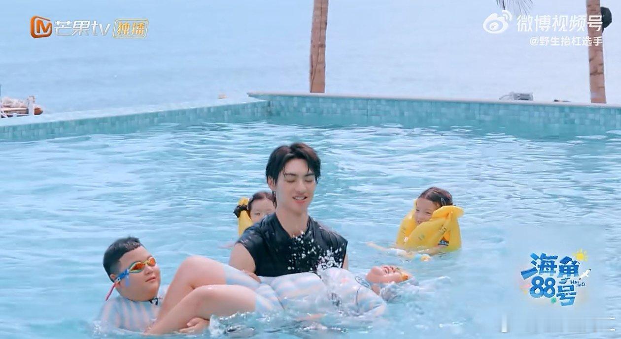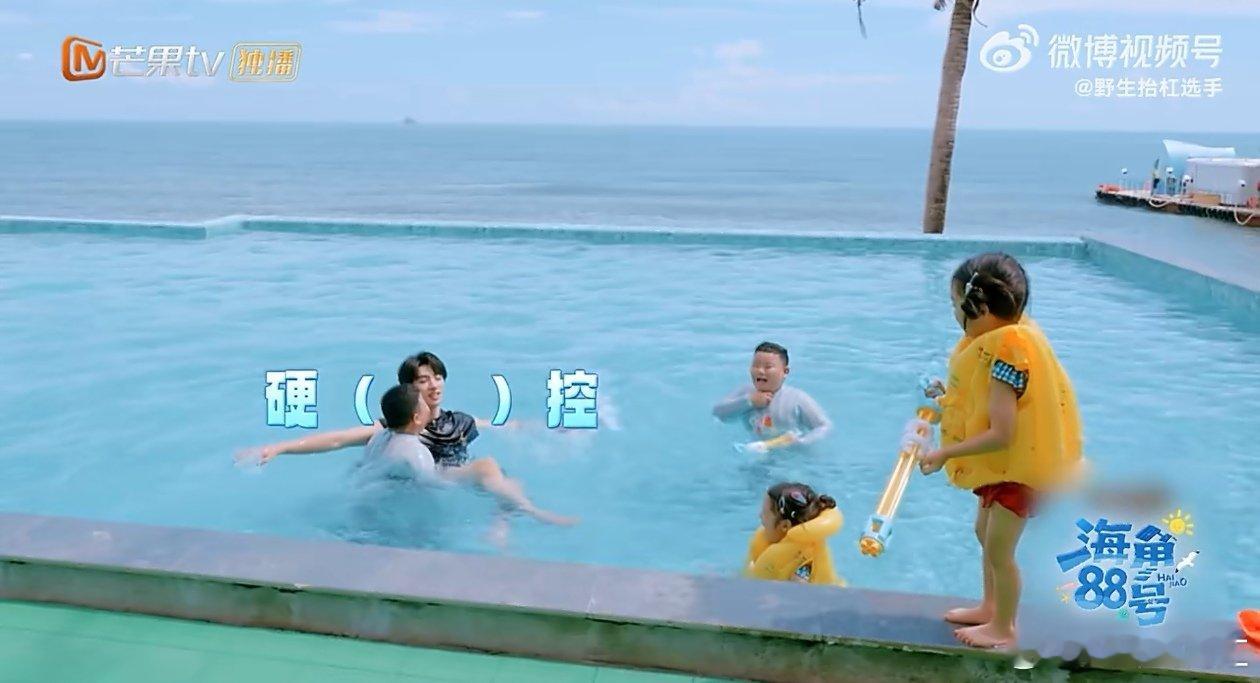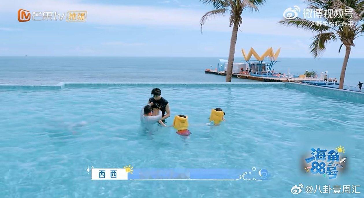 颜安这是录了爸爸去哪儿救命!颜安在民宿的泳池中,一会儿当起游泳教练,教小朋友扑