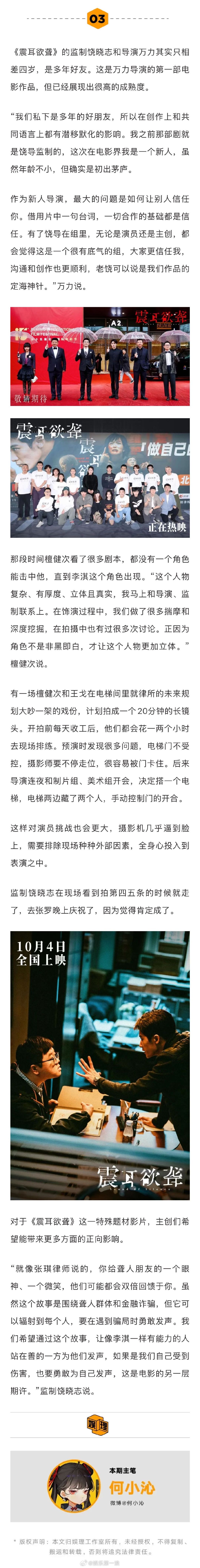 导演说檀健次是经得起大特写的演员 檀健次要求自己手语台词达到肌肉记忆 《震耳欲聋》取材自CODA律师张琪的真实从业经历,张琪律师以自身经历提供了很多创作养分,比如他曾提到自己小时候会有身份认同上的迷茫。导演万力也谈道:“我从他的成长和职业经历中看到了很多可以创作的素材。CODA和律师这两个身份各自都能撑起一部电影,把它们结合在一起,给了我们很大创作空间…”娱理独家↓