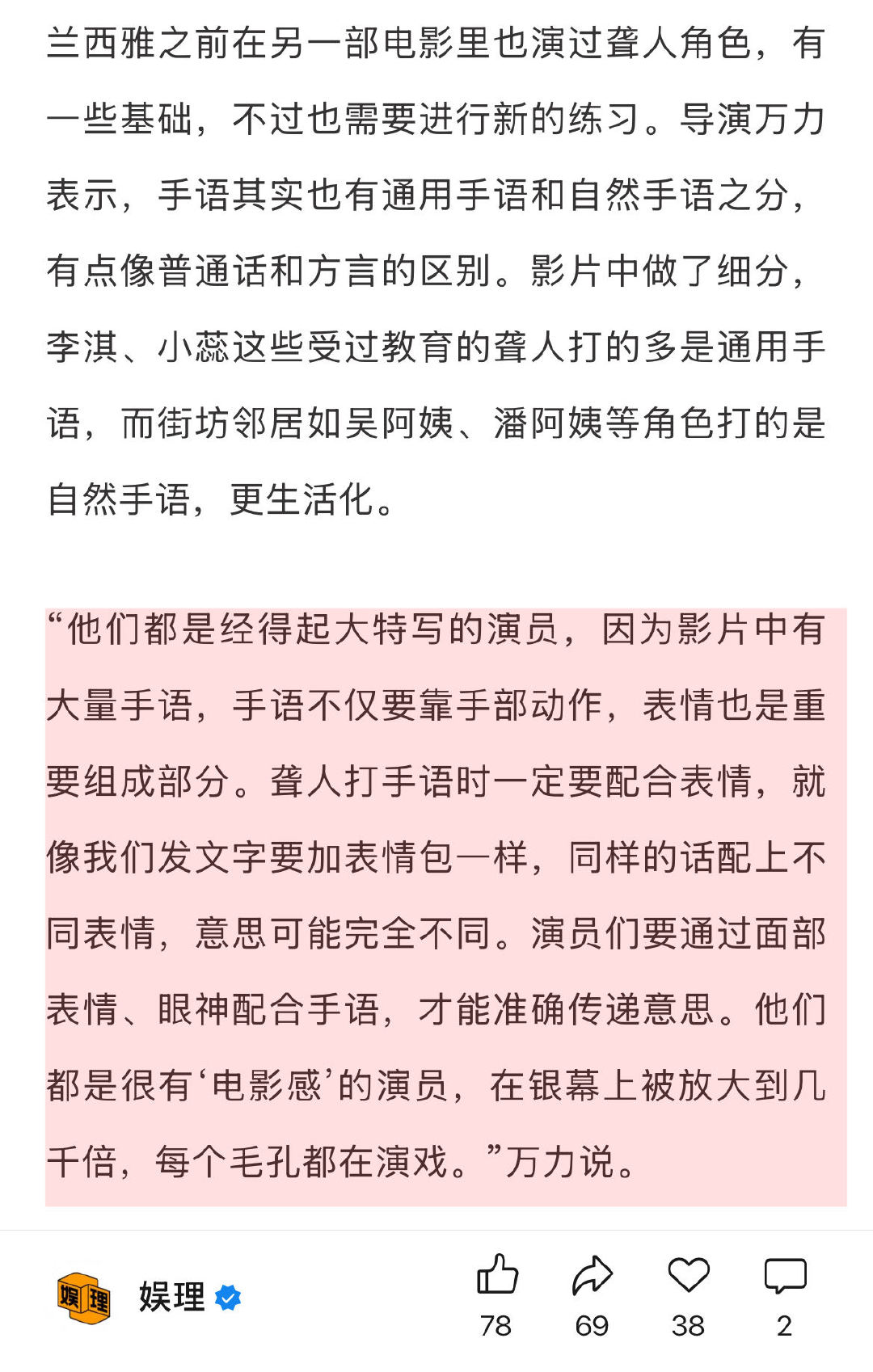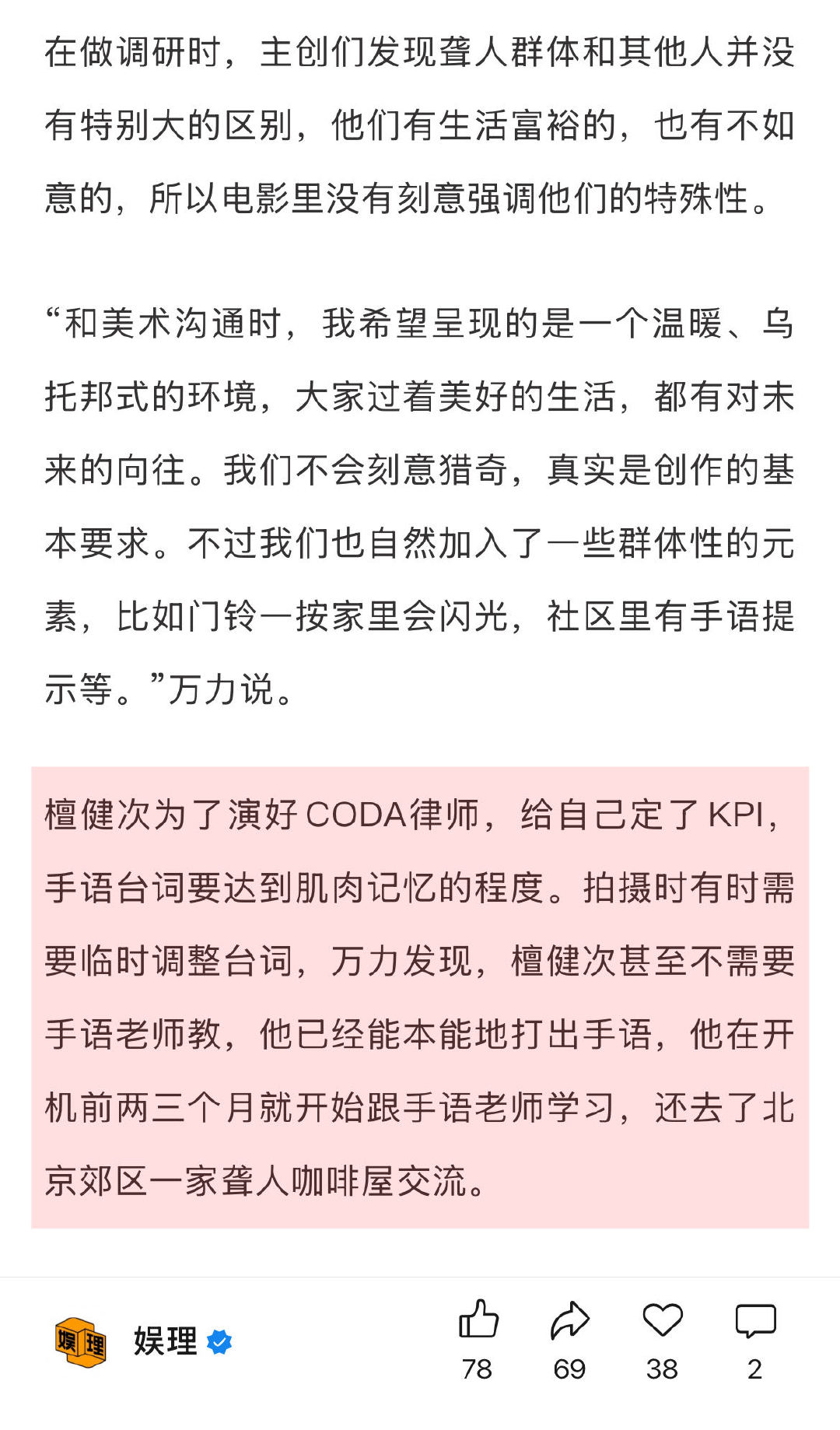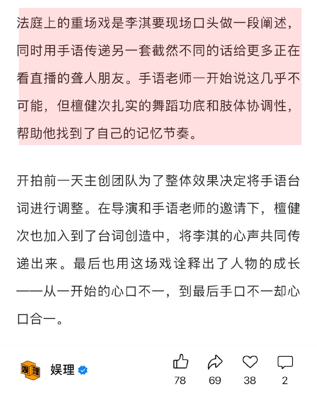 导演说檀健次是经得起大特写的演员 檀健次要求自己手语台词达到肌肉记忆 为了演好CODA律师,檀健次要求自己手语台词要达到肌肉记忆的程度。法庭上的重场戏除了口头阐述,还需要用手语传递另一套截然不同的话给更多正在看直播的聋人朋友。手语老师一开始说这几乎不可能,但檀健次扎实的舞蹈功底和肢体协调性,帮助他找到了自己的记忆节奏…娱理独家↓