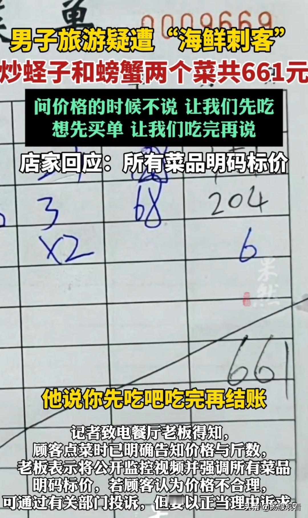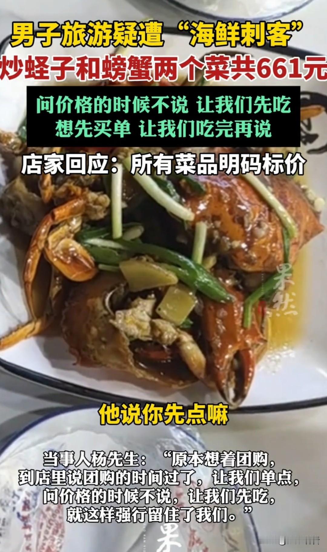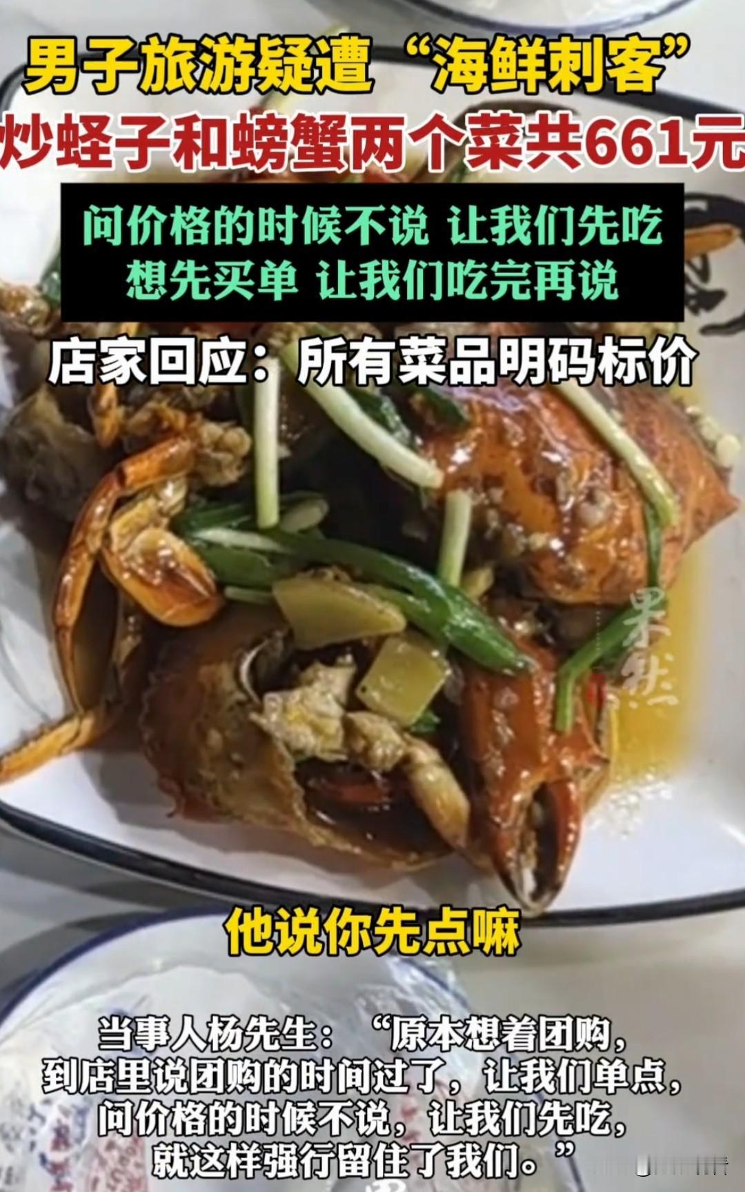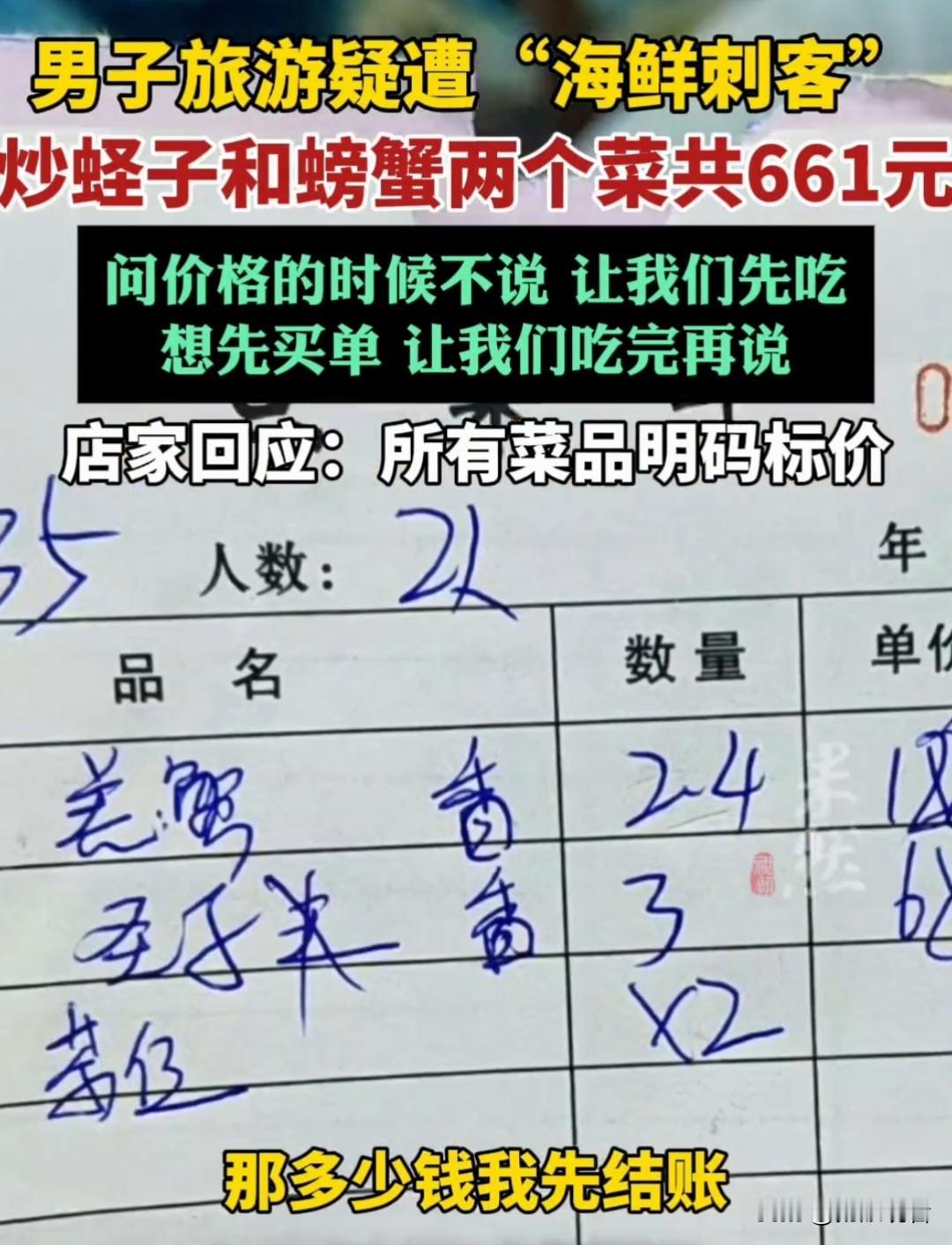 国庆吃海鲜遭“盲盒暴击”!2个菜661元,问价只说“不贵”,结账时手都抖了!10月6日,广东惠州的杨先生就踩了个大雷!和朋友点俩菜,炒蛏子配螃蟹,结账时账单蹦出661元,当场让他怀疑自己看错了小数点。 我觉得这事说起来满是槽点。杨先生本来想团个套餐省点钱,到店被告知“团购时间过了”,只能单点。他心里犯嘀咕,特意问服务员价格,结果对方只含糊其辞:“都是新鲜的,不贵”“螃蟹按大小算,先挑再说”,连称重时都避而不谈具体金额,一个劲催“先吃,吃完再算”。 等俩菜上桌,杨先生还没品出鲜味儿,结账时就被泼了冷水:螃蟹188元/斤,2.4斤收了451元;蛏子68元/斤,3斤算204元,再加6元茶位费,合计661元。隔壁桌大哥听了都咋舌,说自己三个菜花了一千多,这哪是吃海鲜,分明是被“海鲜刺客”盯上了。 更气人的是店家的回应,一口咬定“所有菜品明码标价”,还说实际收费比标价的288元/斤低了不少,甚至要公开监控自证清白。可这话根本站不住脚:当地同规格膏蟹批发价才80-120元/斤,蛏子零售价也就30-40元/斤,涉事餐厅的售价直接翻倍,螃蟹毛利率都飙到56.7%,远超行业警戒线。有网友算过账,菜市场买同款食材自己做,66块钱就能搞定,这差价简直离谱。 更坑的是隐性套路:螃蟹的捆绑绳算不算重量、蛏子3斤生重炒完只剩1.8斤的出成率,店家压根没提前说明。广东省消委会早有规定,鲜活海鲜加价不能超进货价80%,还得明示计量方式,这店家明显踩了红线。 好在事情发酵后有了转机,杨先生删掉投诉视频,店家相关人员退了400元,双方达成调解,当地街道办也配合市场监管部门介入调查。但网友们的吐槽停不下来:“‘先吃不贵’就是宰客暗号”“这套路跟当年青岛大虾没差,就是换了个地方”“明码标价咋不点菜时拿出来?”。 我认为大家不是不能接受海鲜贵,反感的是这种“先斩后奏”的套路。旅游季商家想挣钱能理解,但把“待客之道”变成“宰客之道”,砸的可是整个地方的招牌。下次去海边吃饭,可得记住:不问清单价不伸手,不看明标价不下单,别让一顿饭毁了好心情!