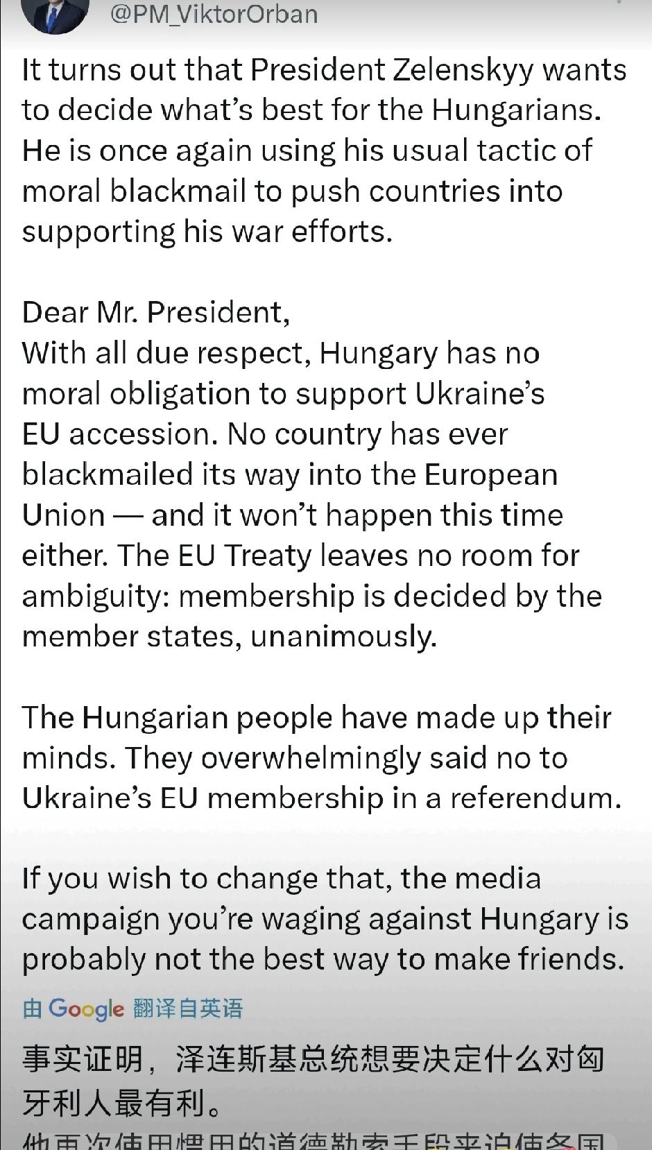匈牙利总理欧尔班今日(北京时间10月7日)强硬喊话泽连斯基,强调匈牙利无义务支持