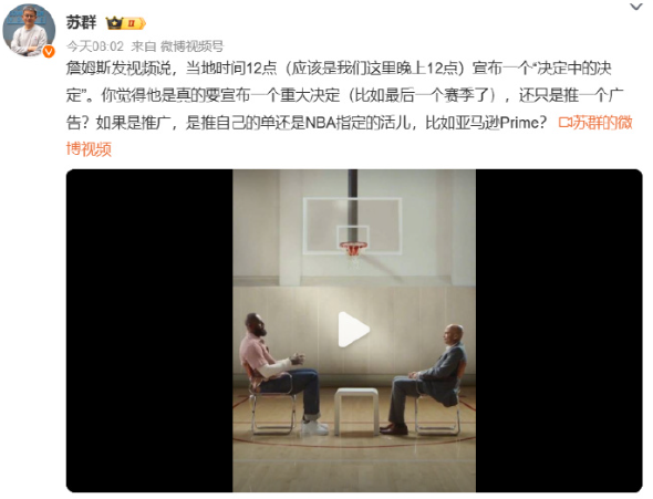 今天凌晨,詹姆斯突然更新社媒动态,他写道:“所有决定中的决定,10月7日,美东时间中午12点。”换算成北京时间即明天凌晨0点。 知名篮球评论员苏群在社媒上谈到了詹姆斯的决定,具体如下: 詹姆斯发视频说,当地时间12点(应该是我们这里晚上12点)宣布一个“决定中的决定”。你觉得他是真的要宣布一个重大决定(比如最后一个赛季了),还只是推一个广告?如果是推广,是推自己的单还是NBA指定的活儿?